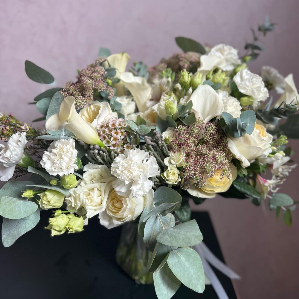 Калла – 8 шт.Роза одноголовая – 6 шт.Пионовидная роза – 7 шт.Амми – 3 шт.Лизиантус – 4 шт.Оксипеталум – 5 шт.Альстромерия – 5 шт.Гвоздика – 13 шт.Бруния – 5 шт.Хамелациум – 6 шт.Эвкалипт – 7 шт.