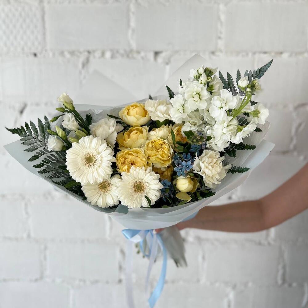 Маттиола – 3 шт.Папоротник – 2 шт.Гербера – 3 шт.Диантус – 3 шт.Фисташка – 5 шт.Оксипеталум – 2 шт.Упаковка дизайнерская – 3 шт.Пионовидная кустовая роза – 2 шт.эустома белая – 2 шт.