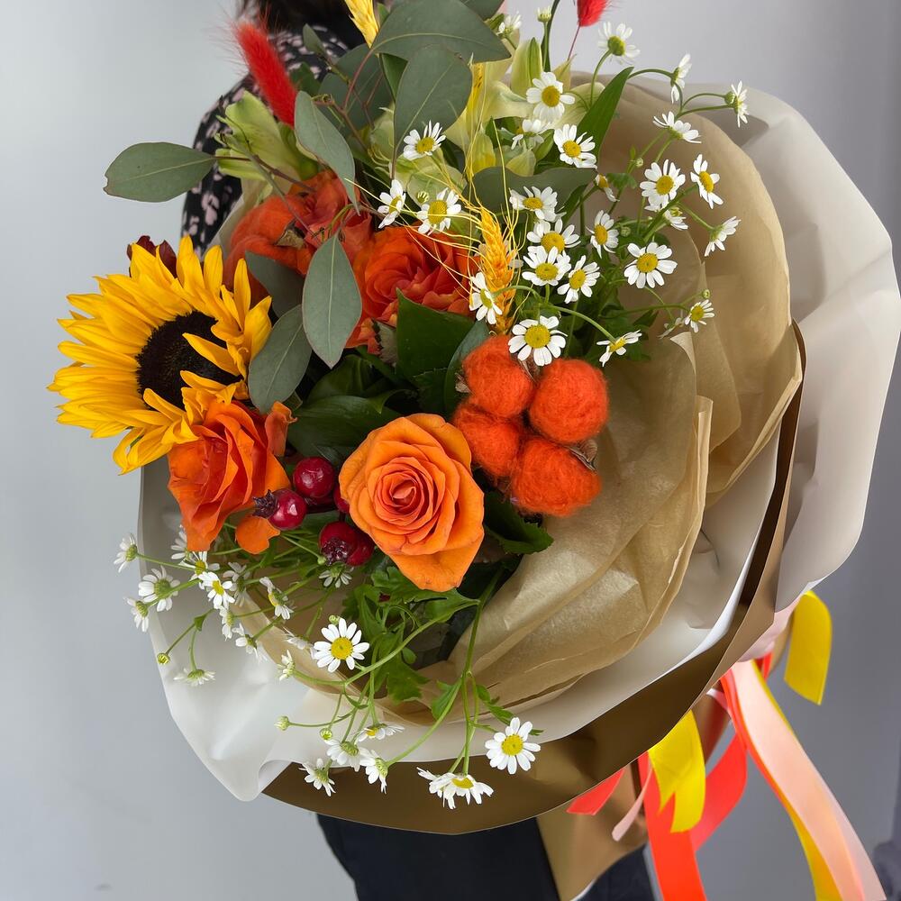 Категорий: Альстромерии, Кустовые розы, Подсолнухи, Розы, Ромашки, Сухоцвет