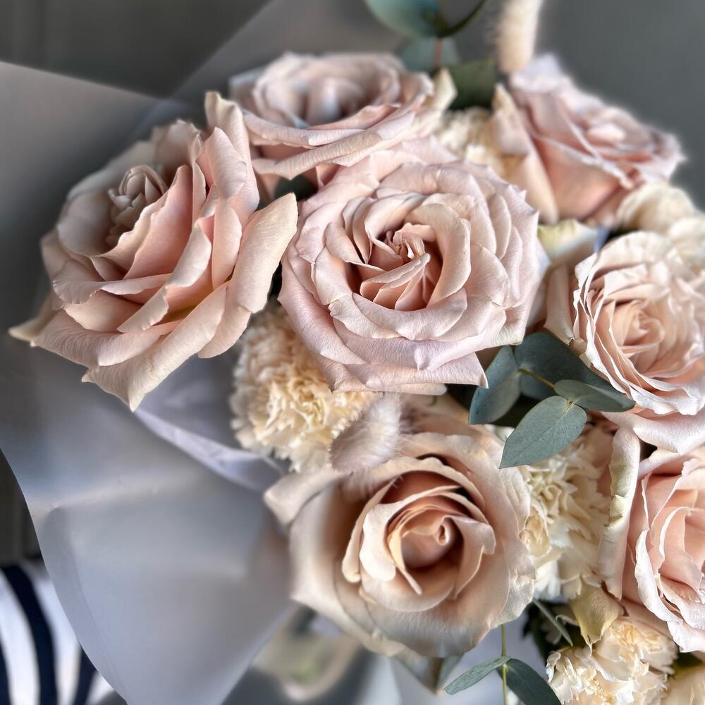 Гвоздика кремовая – 7 шт.Эвкалипт – 1 шт.Атласная лента – 1 шт.Лагурус (сухоцвет) – 4 шт.Авторская упаковка – 1 шт.квиксенд роза – 9 шт.