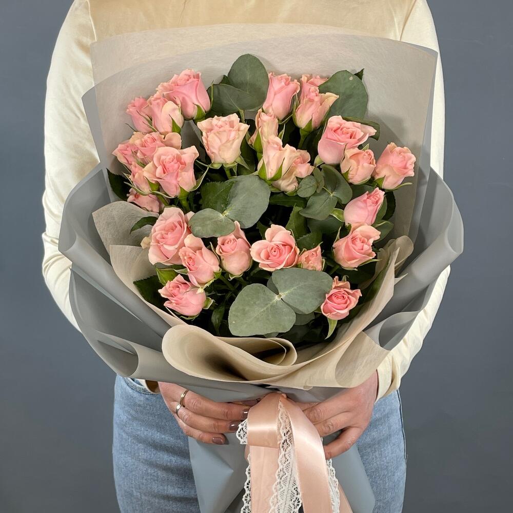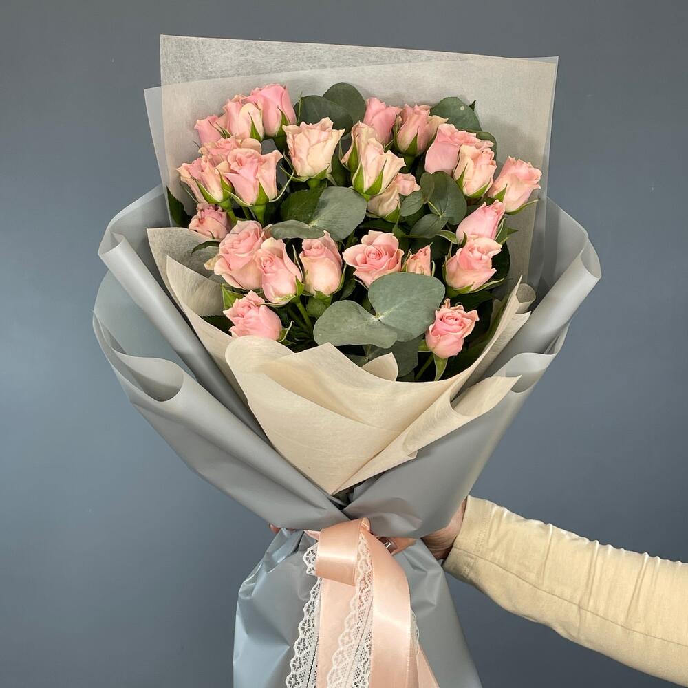 Лента – 2 шт.Роза кустовая – 7 шт.Эвкалипт – 1 шт.Упаковка – 1 шт.Фисташка – 2 шт.