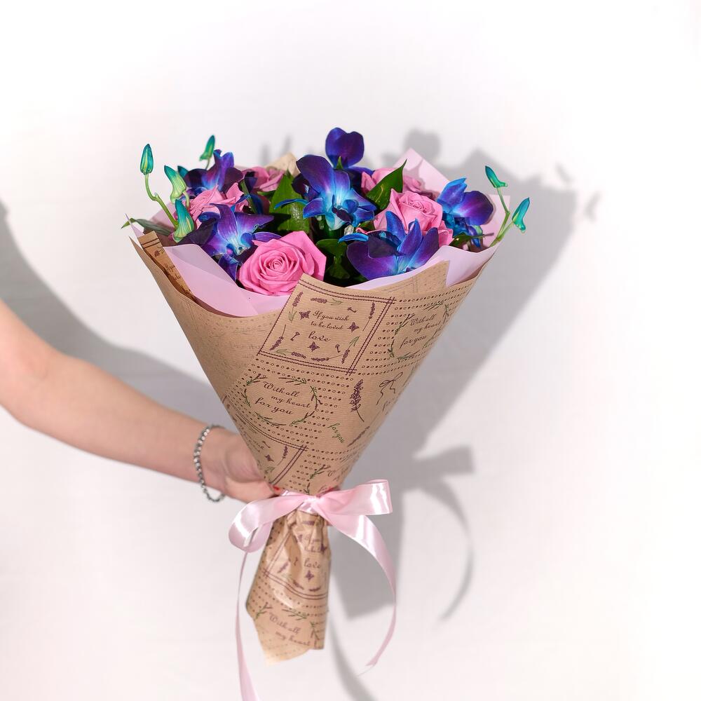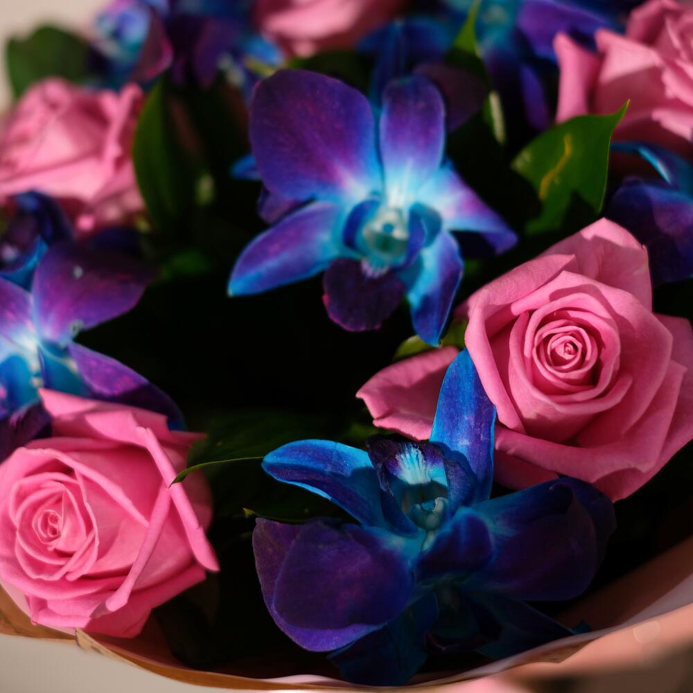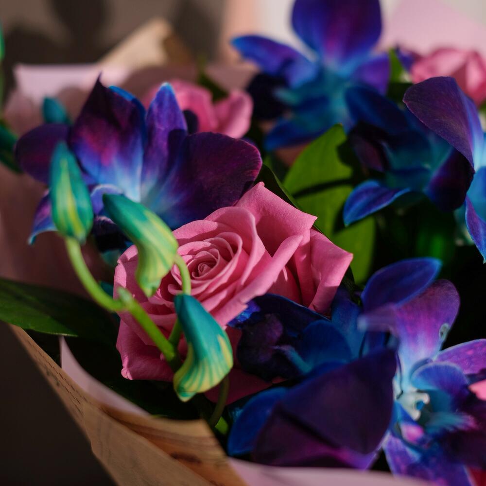 Букет из синих орхидей и розовых роз. Букет 128 ALMOND ROSES