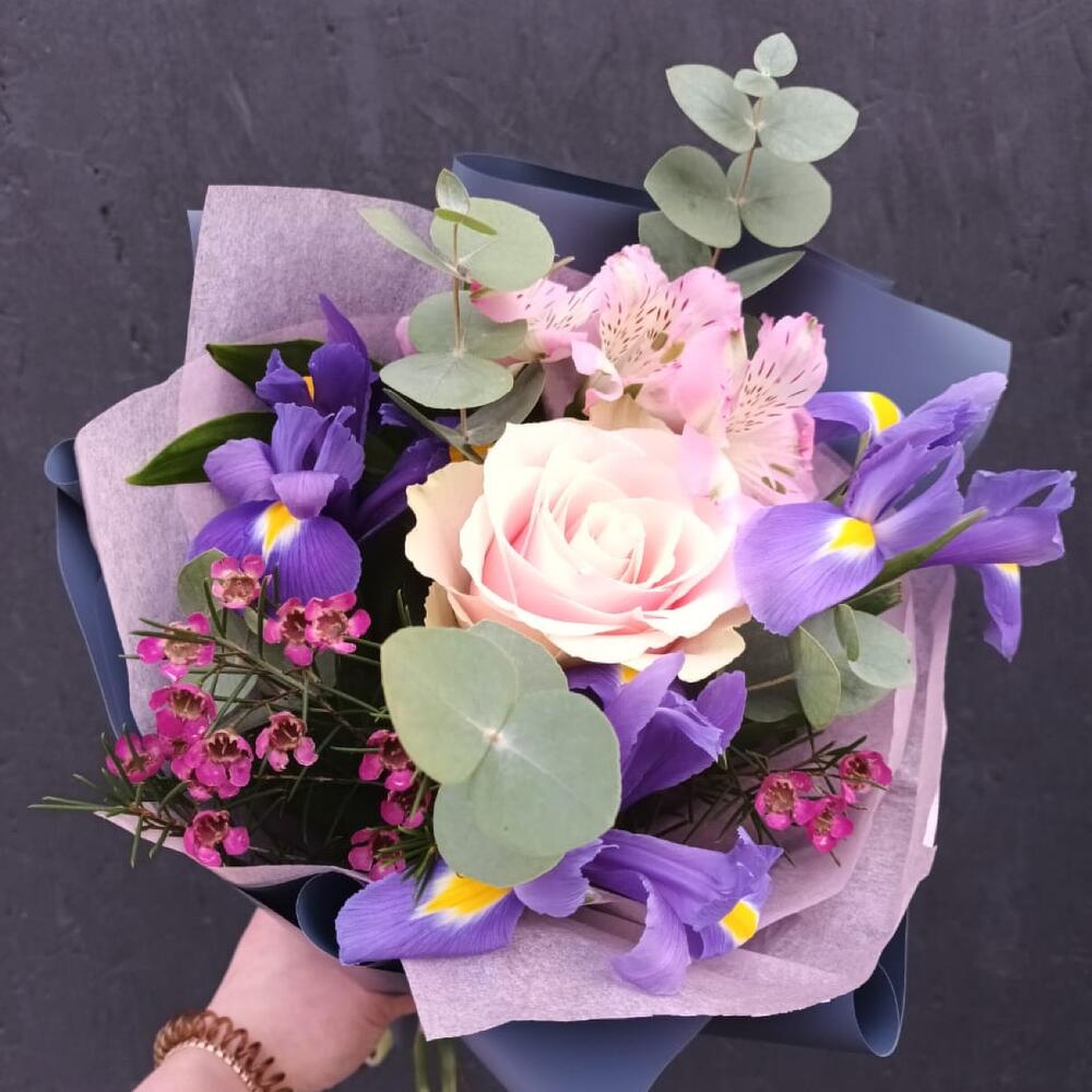 Букет-комплимент с ирисами, розой, альстромерией, ваксфлауэром( вереском) с эвкалиптом