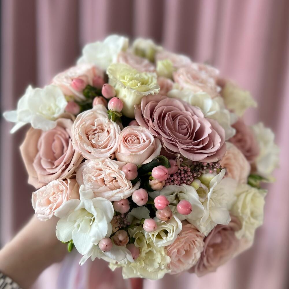 Гиперикум – 3 шт.Лизиантус – 5 шт.Озотамнус – 2 шт.Фрезия – 9 шт.Роза пионовидная – 7 шт.Атласная лента – 2 шт.Кустовая пионовидная роза – 7 шт.