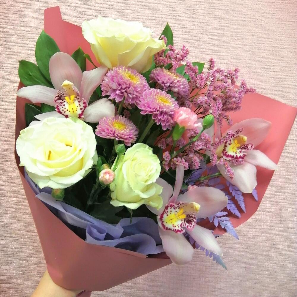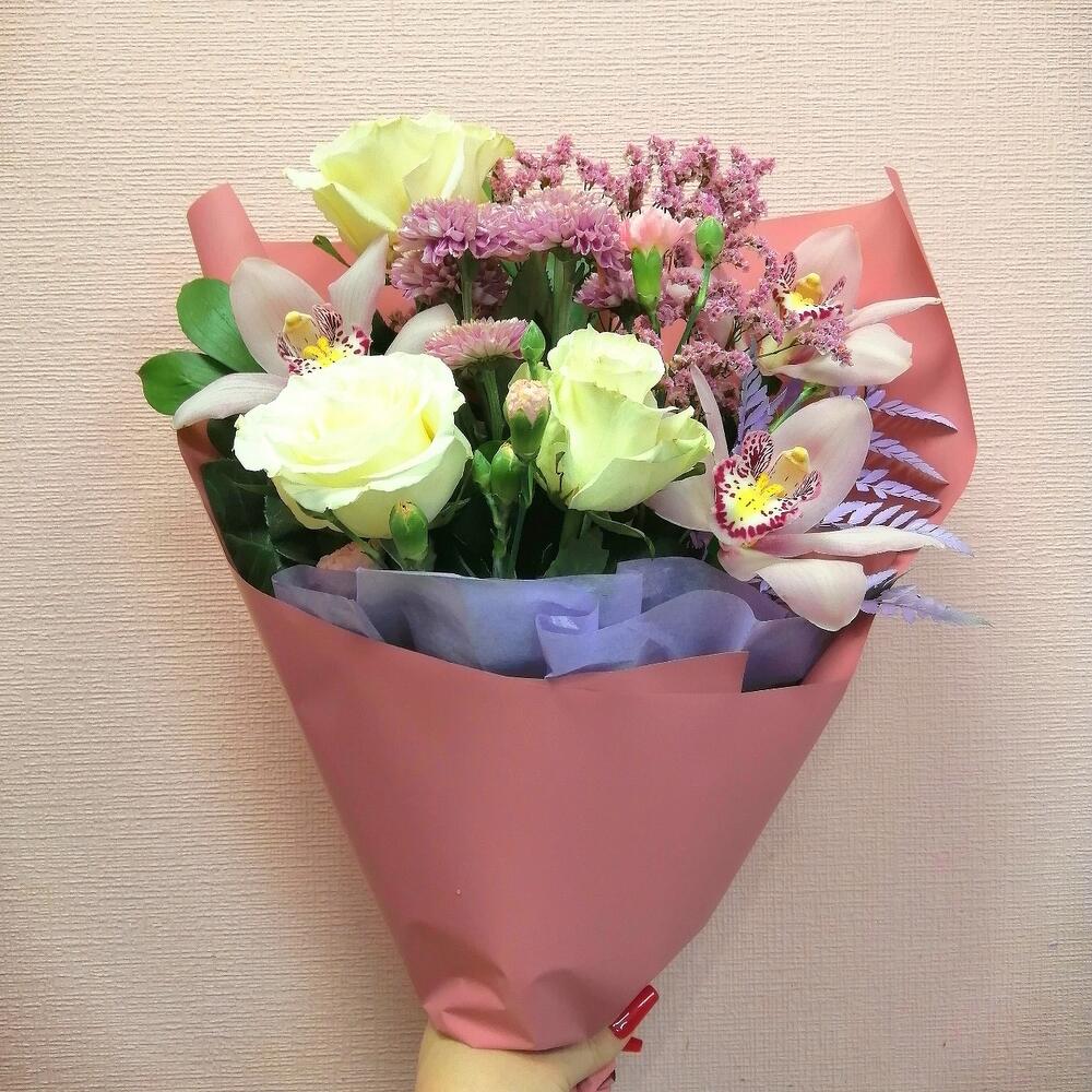Лента – 1 шт.Лимониум – 2 шт.Папоротник – 1 шт.Хризантема кустовая – 1 шт.Роза Эквадор – 3 шт.Гвоздика – 2 шт.Упаковка дизайнерская – 1 шт.Рускус сочи – 4 шт.Орхидея цветок – 3 шт.