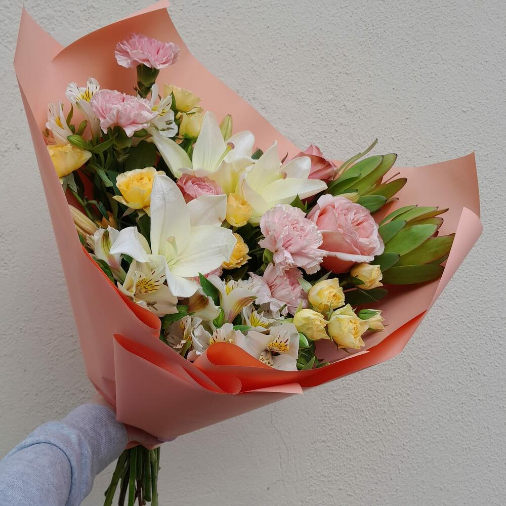 Категорий: Альстромерии, Гвоздики, Кустовые розы, Лилии, Пионовидные розы, Розы
