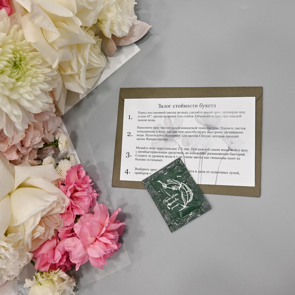 - Сроки возврата: Претензии по качеству букета принимаются в течение 24 часов с момента его получения.