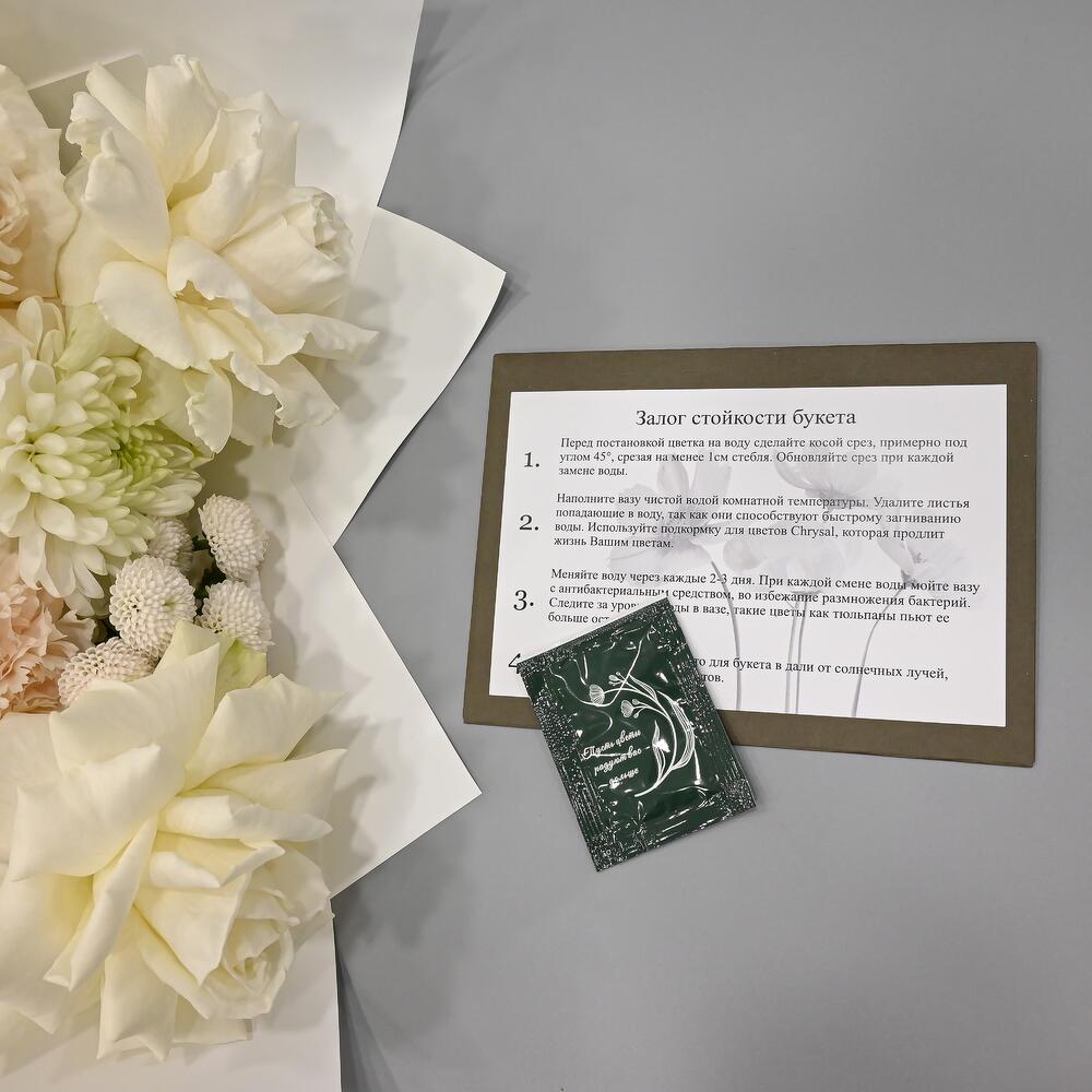 - Сроки возврата: Претензии по качеству букета принимаются в течение 24 часов с момента его получения.