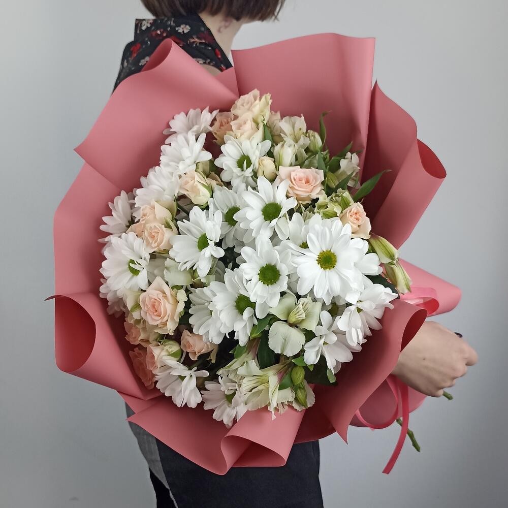 Альстромерия – 4 шт.Лента – 2 шт.Роза кустовая – 5 шт.Хризантема кустовая – 5 шт.Пленка матовая – 2 шт.