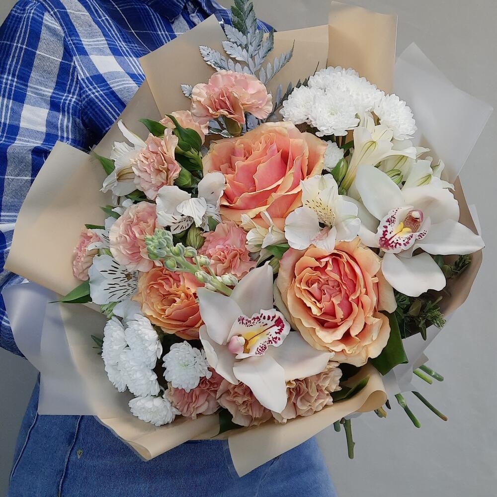 Роза – 3 шт.Альстромерия – 3 шт.Маттиола – 1 шт.Диантус – 3 шт.Сантини – 2 шт.Орхидея Цимбидиум – 2 шт.Папоротник – 1 шт.Рускус – 10 шт.Упаковка дизайнерская – 2 шт.Лента атласная – 1 шт.