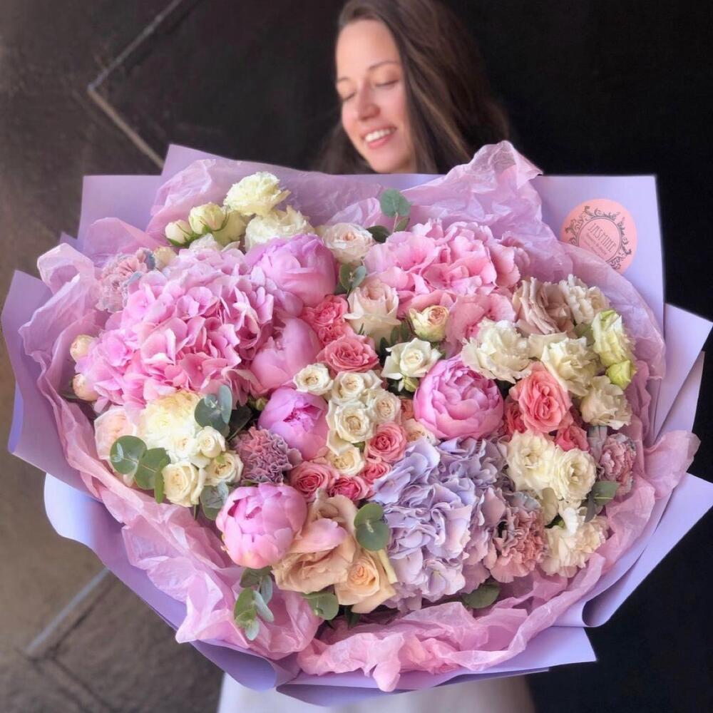 Пион – 5 шт.Гортензия – 3 шт.Роза – 5 шт.Роза кустовая – 10 шт.Лизиантус – 5 шт.Диантус – 5 шт.Эвкалипт – 1 шт.Упаковка дизайнерская – 1 шт.