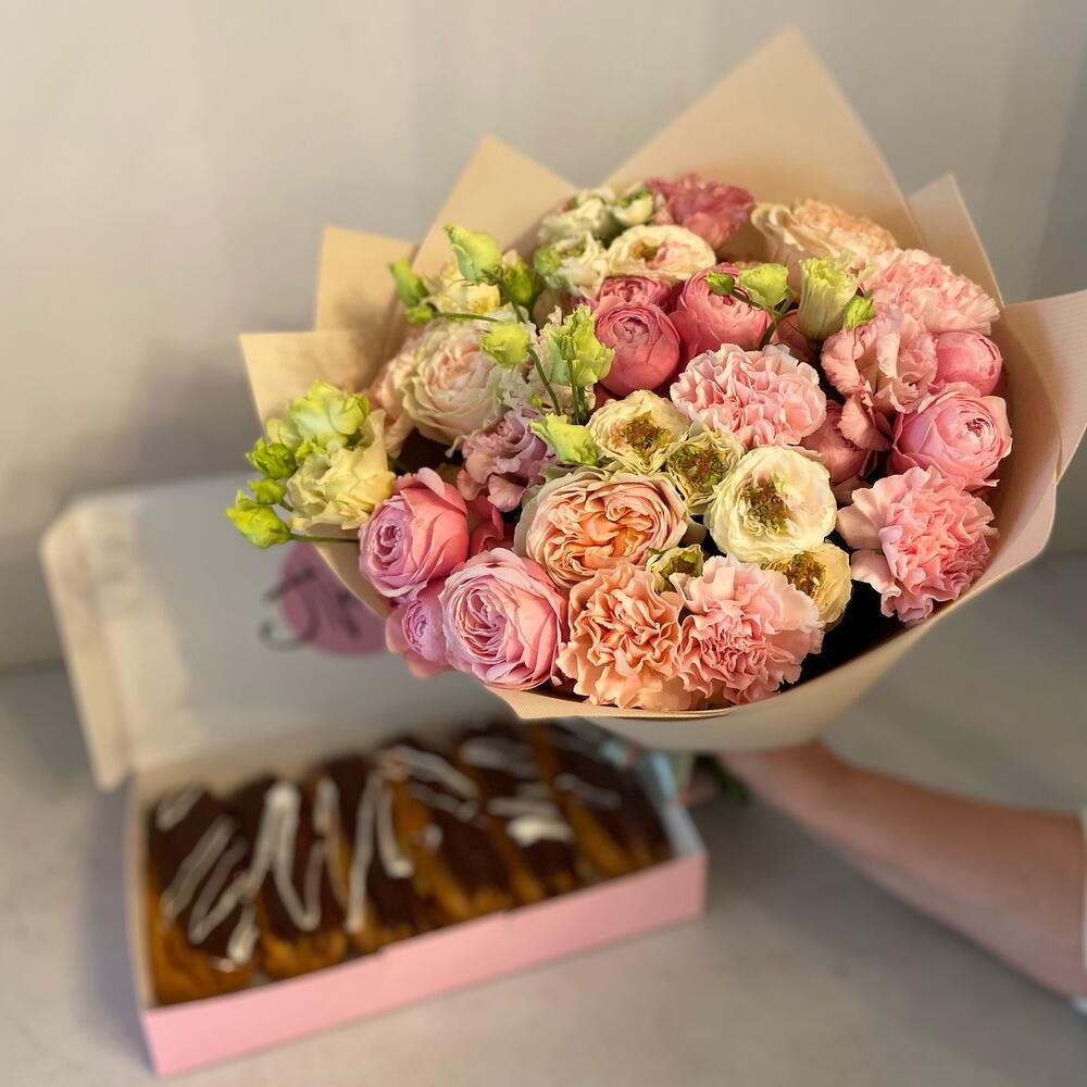 Роза пионовидная кустовая – 3 шт.Роза пионовидная – 3 шт.Открытка – 1 шт.Гвоздика сортовая – 7 шт.Эклеры – 6 шт.Роза садовая кустовая – 3 шт.Дизайнерская упаковка – 1 шт.коробочка – 1 шт.лизтантус алиса – 4 шт.
