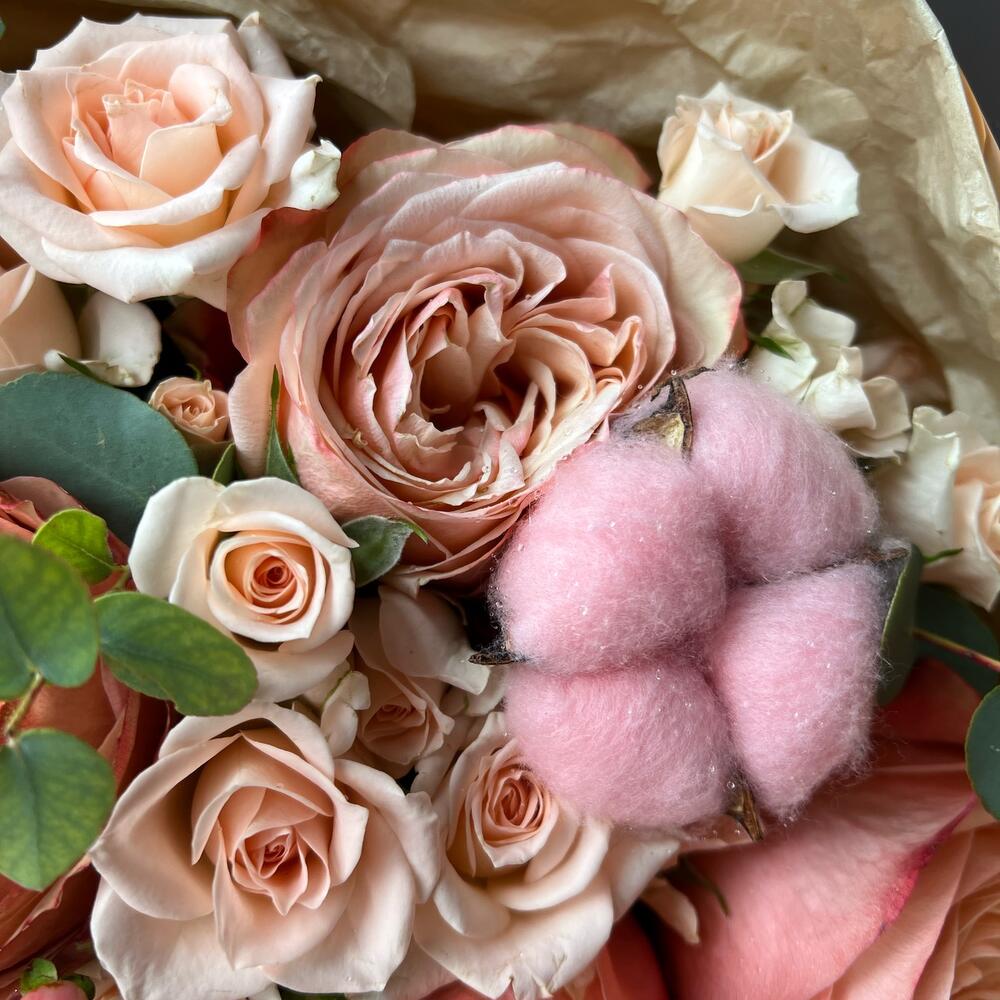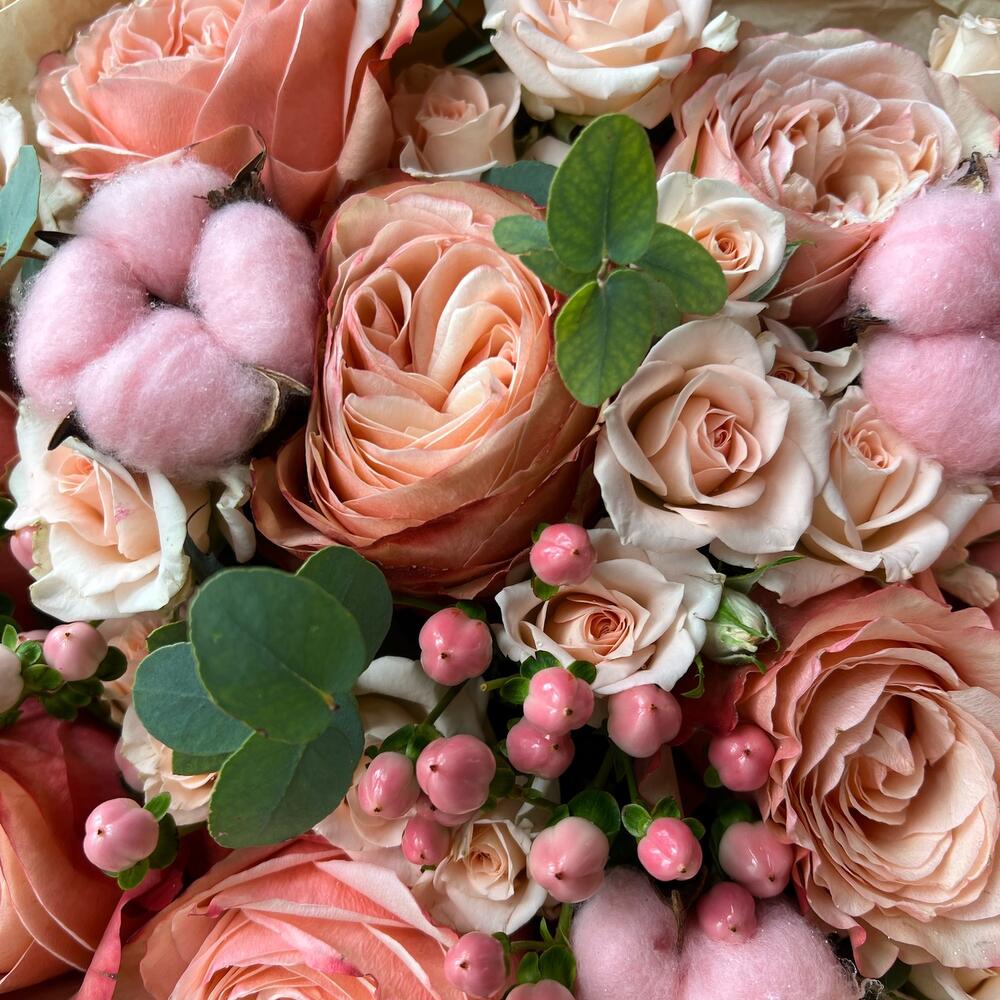 Букет с пионовидными розами, хлопком и ягодами «Персик»