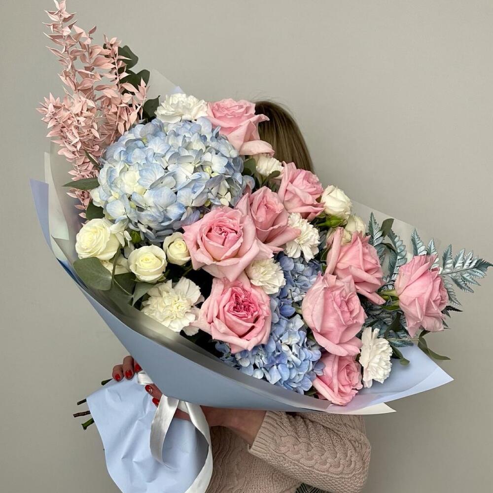 Гортензия – 2 шт.Папоротник – 2 шт.Роза кустовая – 2 шт.Эвкалипт – 2 шт.Роза Эквадор – 9 шт.Диантус – 7 шт.Фисташка – 3 шт.Упаковка дизайнерская – 3 шт.иглица – 2 шт.