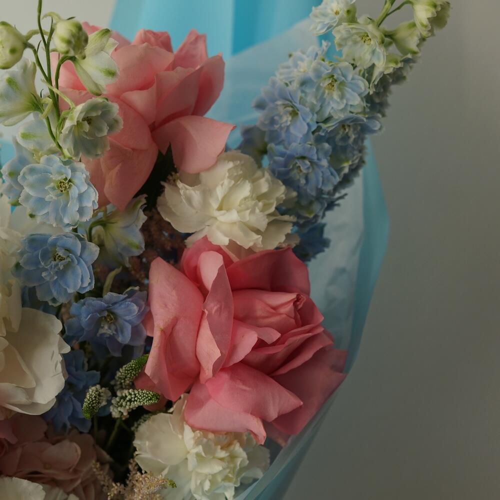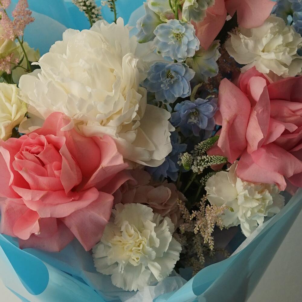Пион – 1 шт.Гортензия – 1 шт.Астильба – 3 шт.Вероника – 2 шт.Диантус – 3 шт.Роза французская – 3 шт.Дельфиниум – 2 шт.Упаковка дизайнерская – 1 шт.