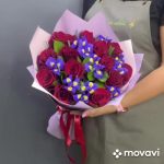 Ирис – 12 шт.Лента – 1 шт.Роза – 13 шт.Зелень – 10 шт.Упаковка – 1 шт.