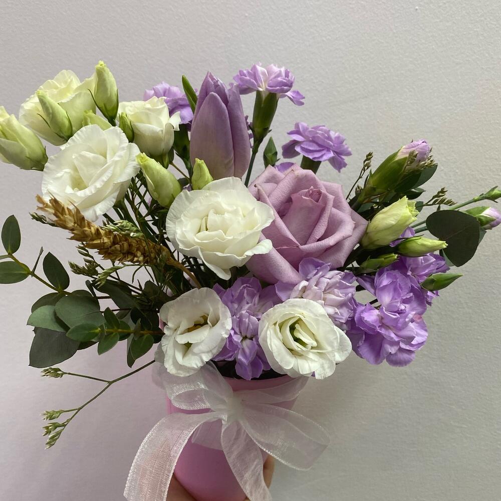 Роза – 1 шт.Эустома – 3 шт.Гвоздика кустовая – 2 шт.Сухоцветы – 1 шт.Эвкалипт – 3 шт.Стакан – 1 шт.Оазис флористический – 1 шт.Лента атласная – 1 шт.
