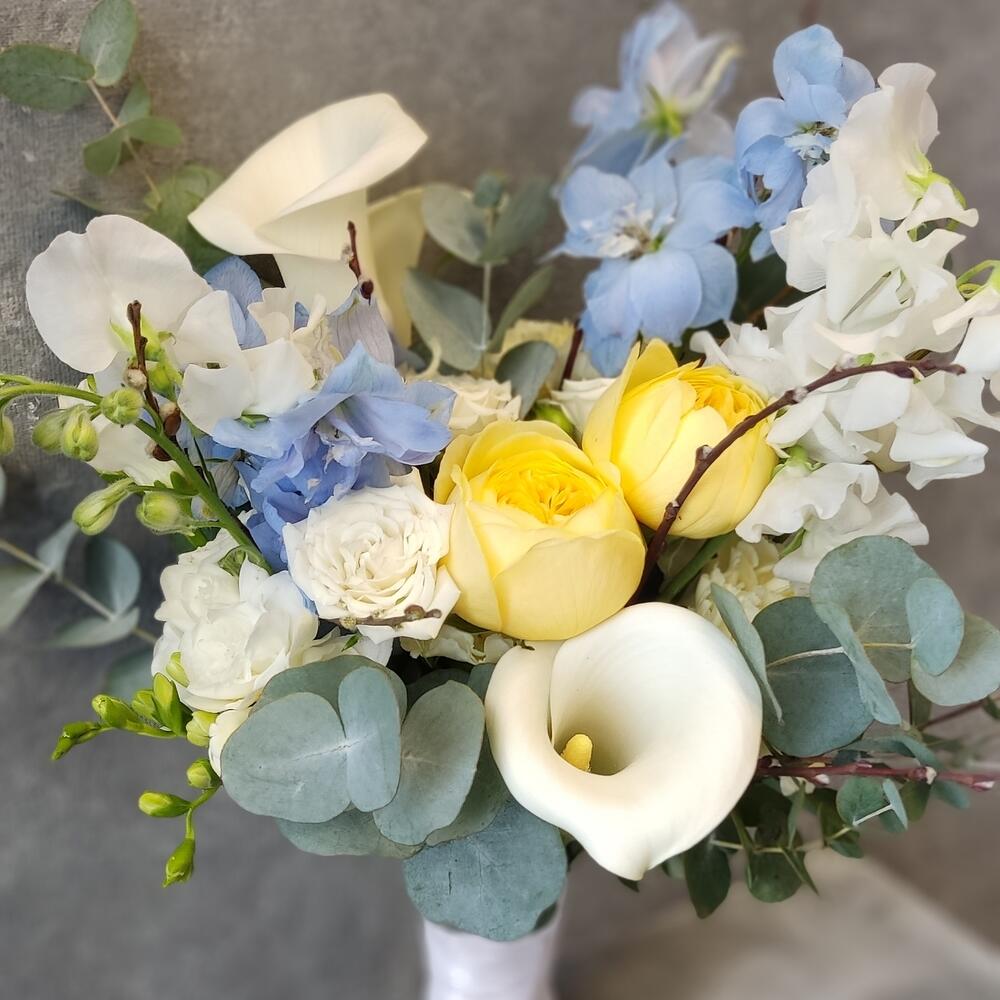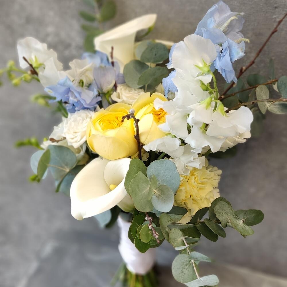 Дельфиниум – 2 шт.Калла – 3 шт.Латирус – 3 шт.Роза кустовая – 3 шт.Эвкалипт – 3 шт.Диантус – 5 шт.Роза садовая – 2 шт.лента декоративная – 1 шт.ветки декоративные – 3 шт.бутоньерка для жениха – 1 шт.