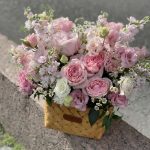 Лизиантус – 5 шт.Роза одноголовая – 5 шт.Роза пионовидная кустовая – 3 шт.Матрикария – 2 шт.Корзина плетеная – 1 шт.Маттиола белая – 8 шт.Оазис флористический – 1 шт.