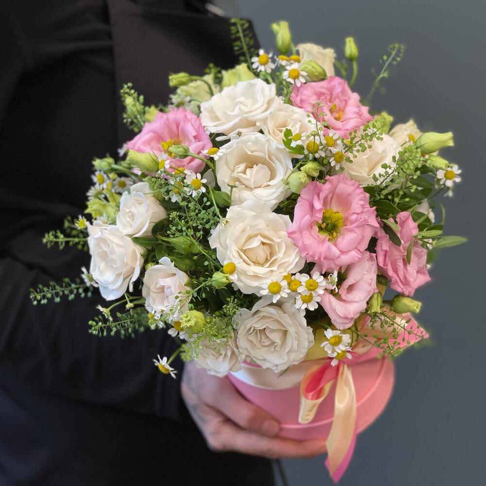 Цветочная композиция в шляпной коробке с розой, лизиантусом и матрикарией.Композиция, которая подарит искренние эмоции каждому.* По вашей просьбе, мы подпишем открытку с наилучшими пожеланиями.* Каждый букет цветов (композиция цветов в коробке) упаковывается в прозрачную плёнку и в крафтовый пакет.* К букету прилагается инструкция по уходу и пакетик с подкормкой для продления жизни срезанных цветов в вазе и цветочных композициях на флористической губке.