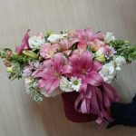 Лилия розовая – 1 шт. Роза Джумилия – 3 шт. Львиный зев розовый – 4 шт. Лизиантус Алиса белый – 3 шт. Хризантема кустовая – 1 шт.
