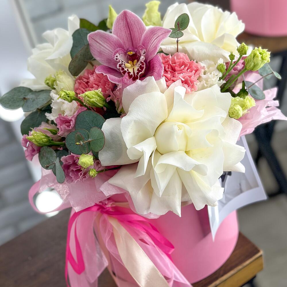 Орхидея Цимбидиум – 1 шт.Эвкалипт – 1 шт.Лизиантус махровый – 2 шт.Открыточка с вашими пожеланиями – 1 шт.роза плая бланка – 3 шт.диантус сортовой розовый – 3 шт.шляпная коробка с лентами и оазисом – 1 шт.