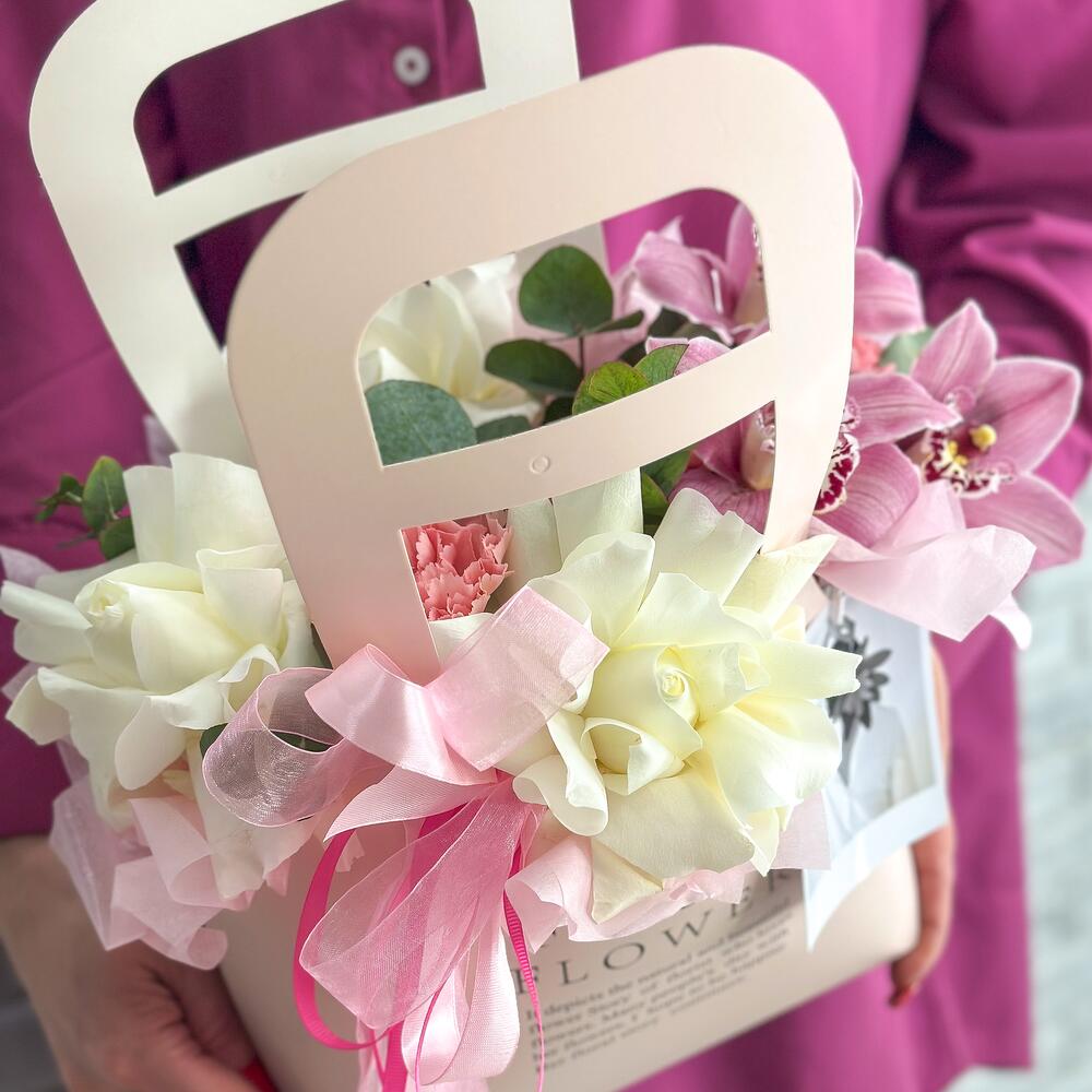Орхидея Цимбидиум – 3 шт.Эвкалипт – 1 шт.Открыточка с вашими пожеланиями – 1 шт.Оазис флористический – 1 шт.Сумочка с ручками из плотного картона ламинированого – 1 шт.Диантус сортовой – 5 шт.роза плая бланка – 3 шт.