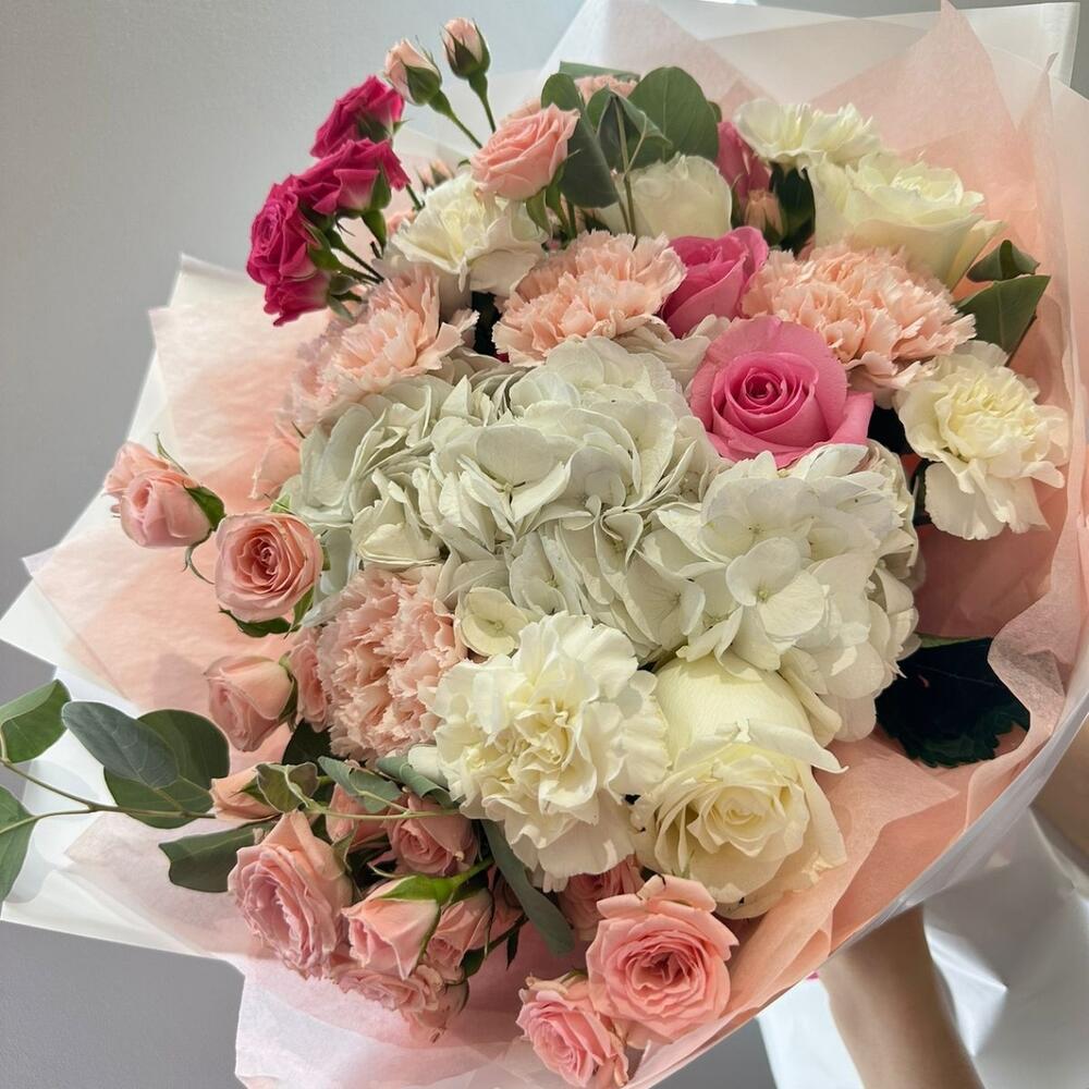 Гвоздики, Пионовидные розы, Розы