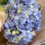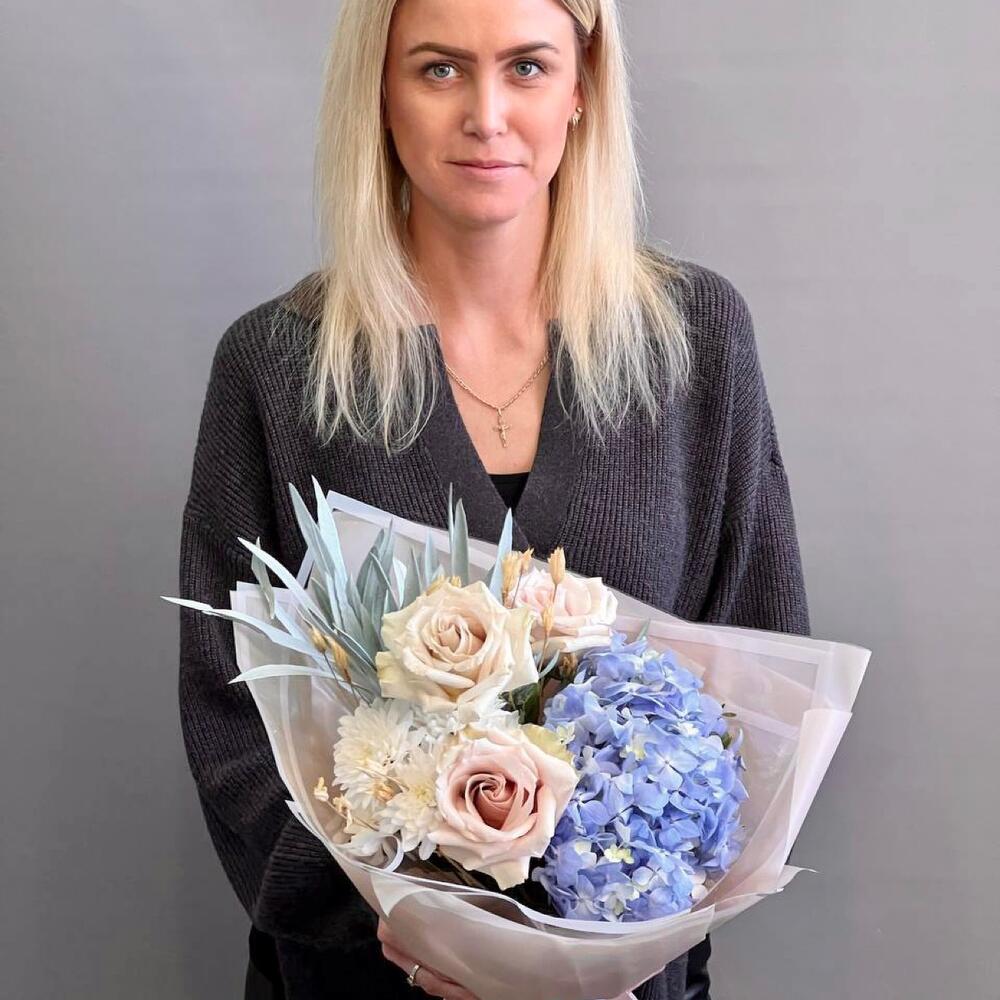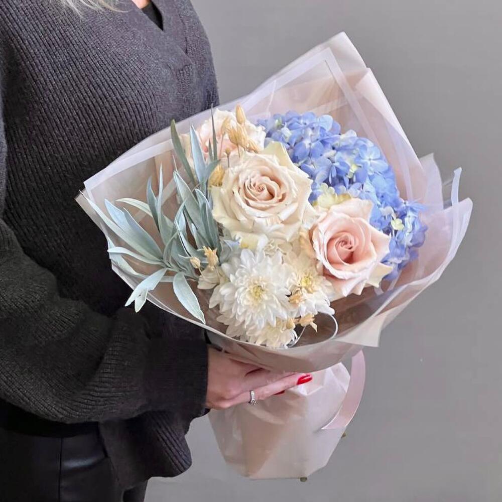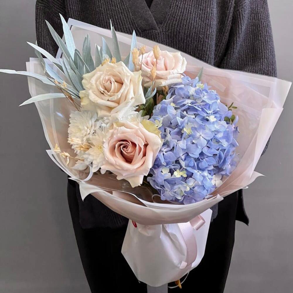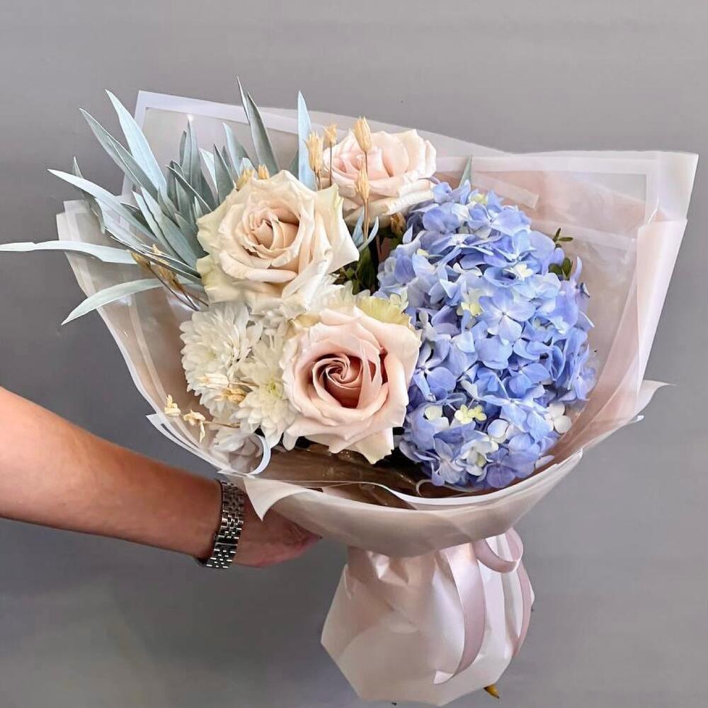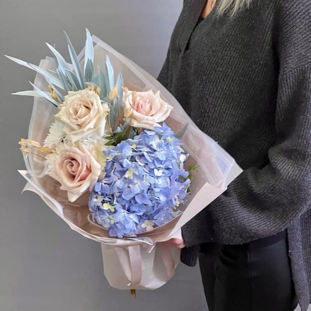 Голубая гортензия и пудровые розы