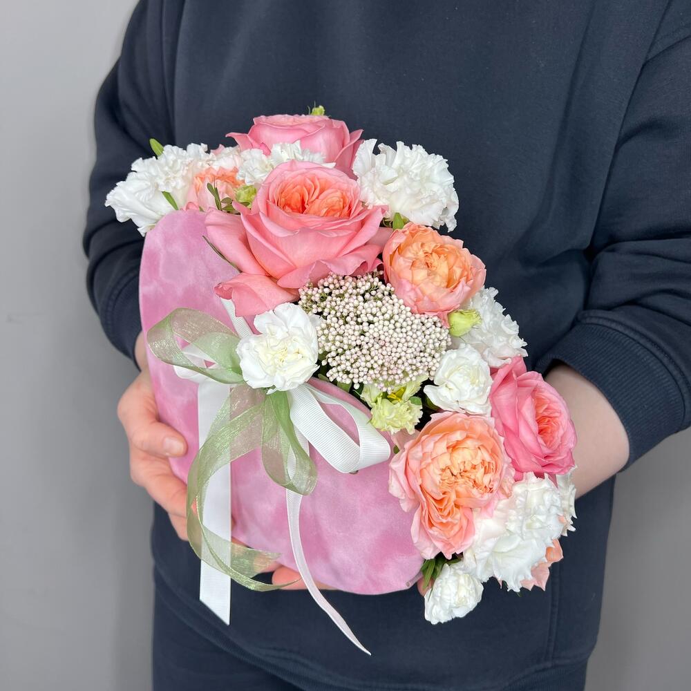 Лизиантус – 1 шт.Озотамнус – 1 шт.Диантус – 2 шт.Роза пионовидная кустовая – 1 шт.Роза пионовидная – 3 шт.Фисташка пучок – 1 шт.сердце декоративное – 1 шт.комплимент от polyanka – 1 шт.