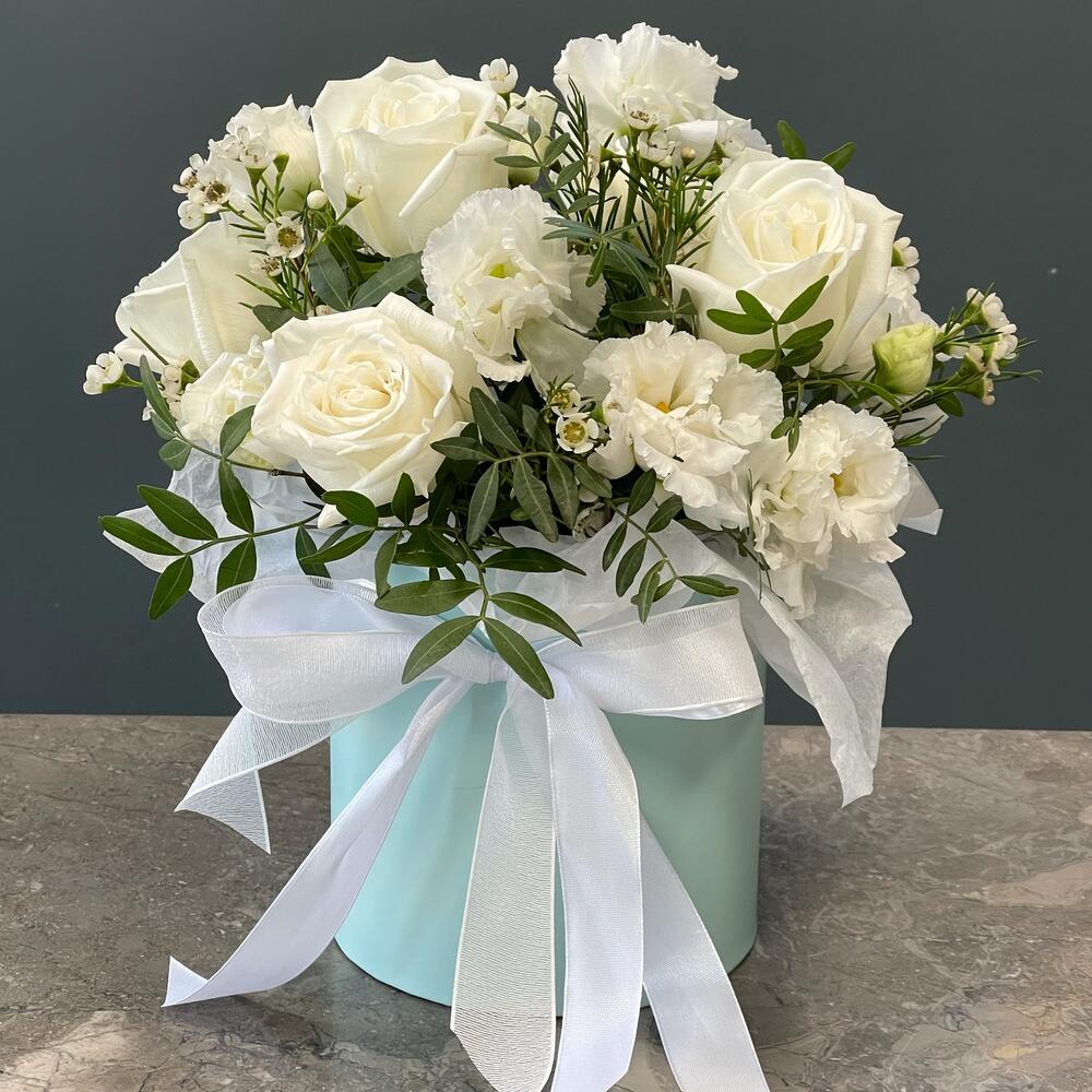Композиция в шляпной коробке с белыми розами "Белоснежная"