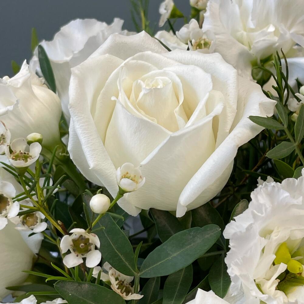 Композиция в шляпной коробке с белыми розами “Белоснежная”