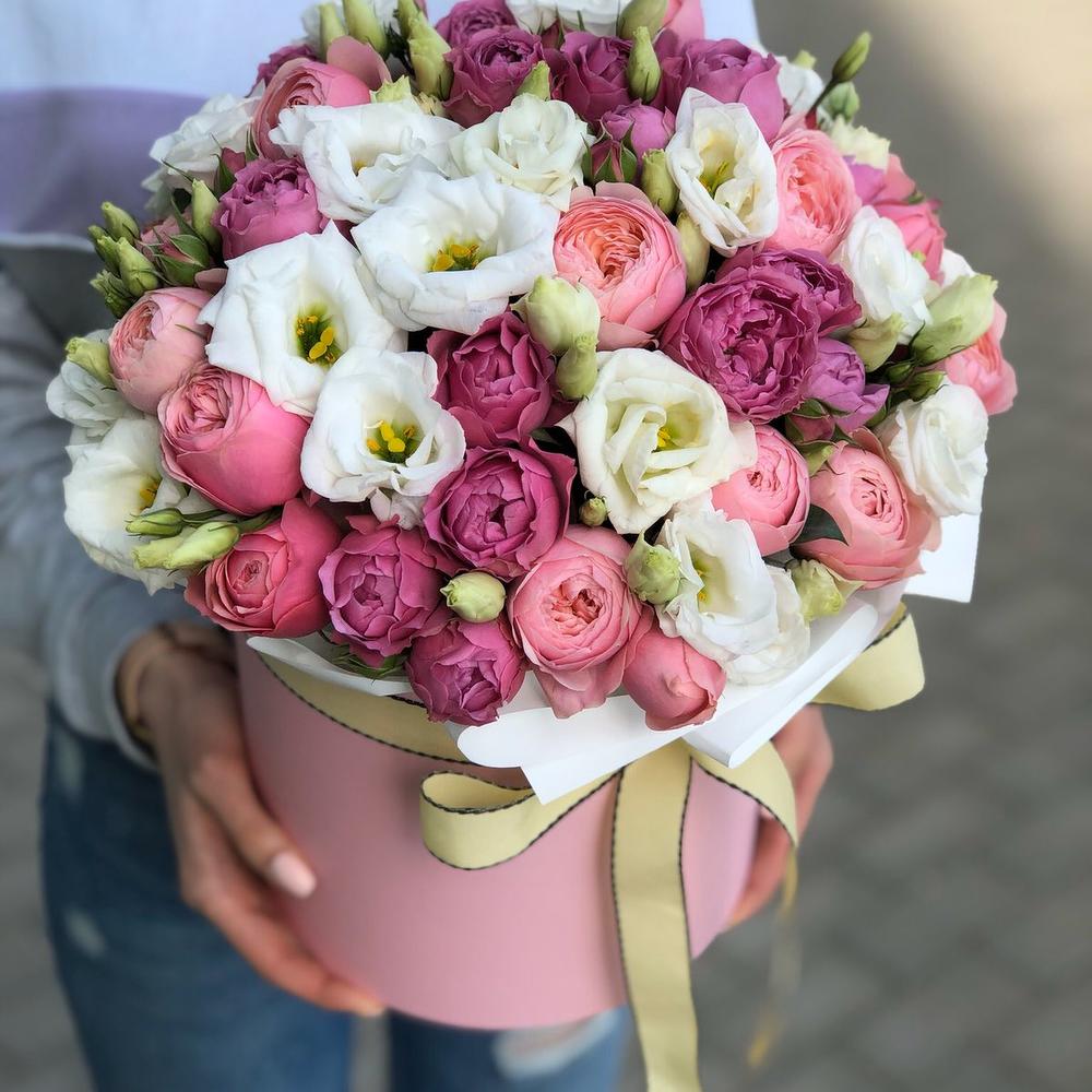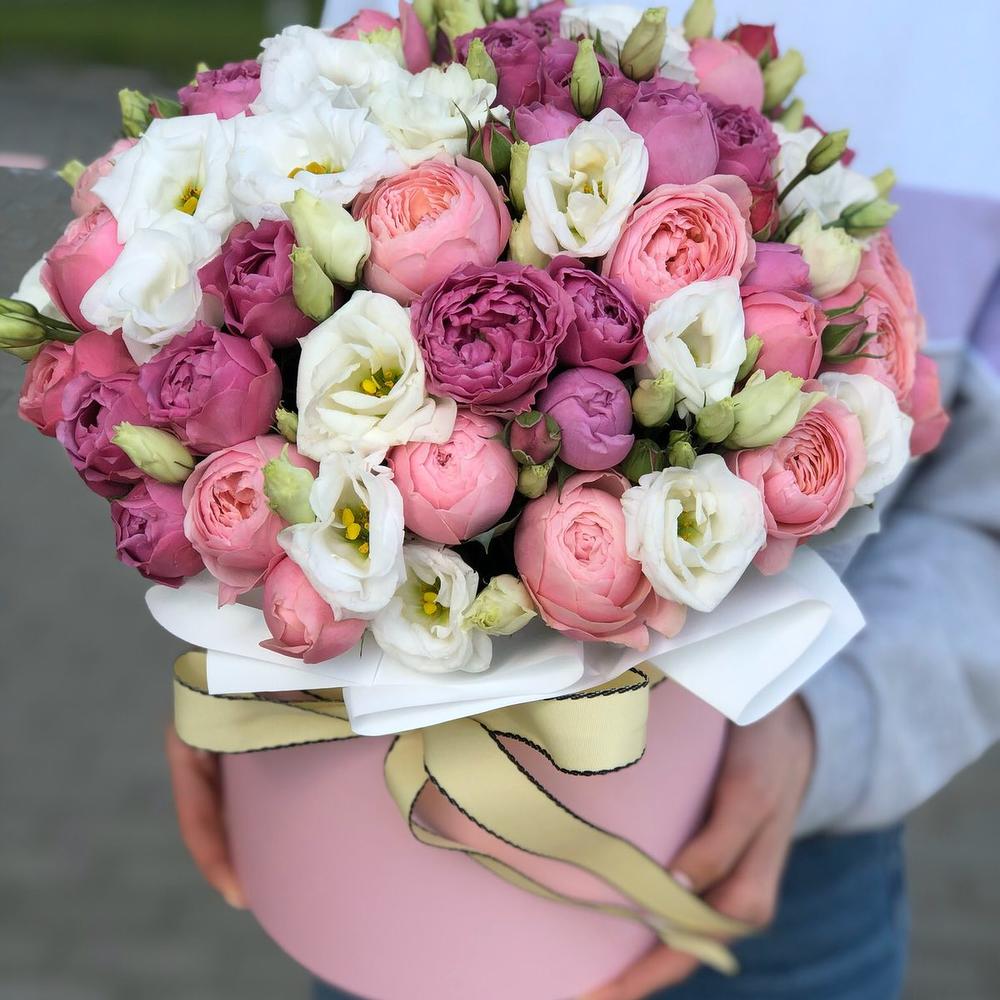 Эустома – 5 шт. Кустовая пионовидная роза – 15 шт. Писташ – 2 шт. Коробка – 1 шт. Оазис – 4 шт.