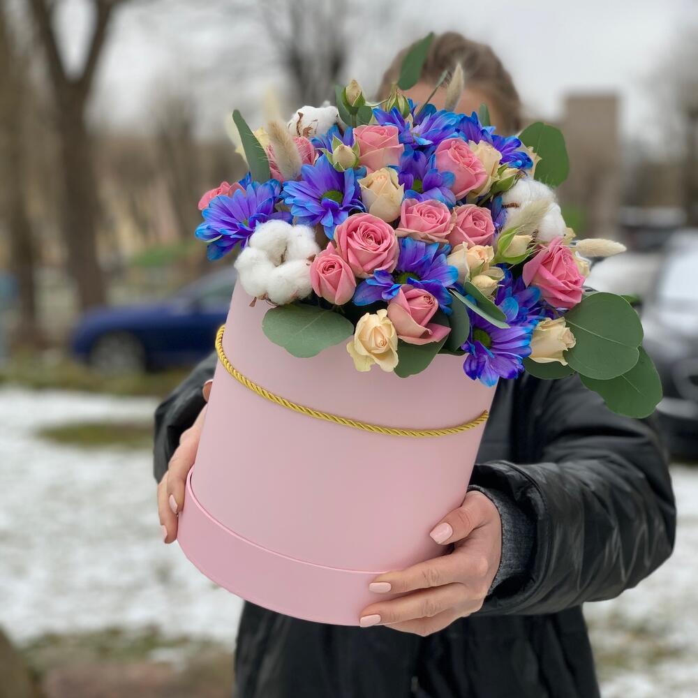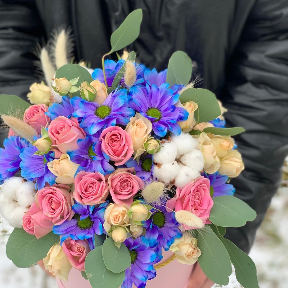 Необычная шляпная коробка с синей хризантемой и кустовой розой, дополнена милыми сухоцветами: хлопком и лагурусом, ароматным эвкалиптом