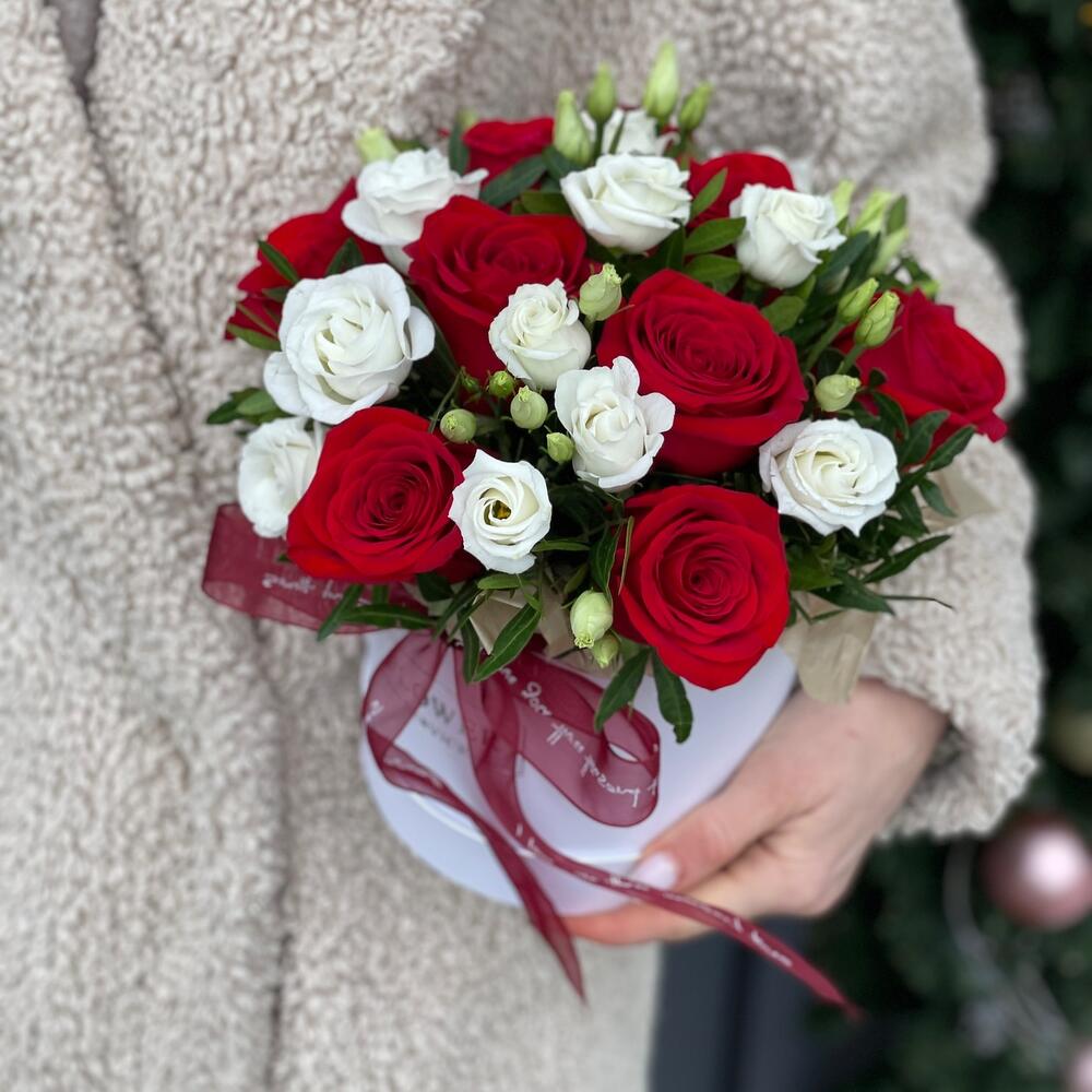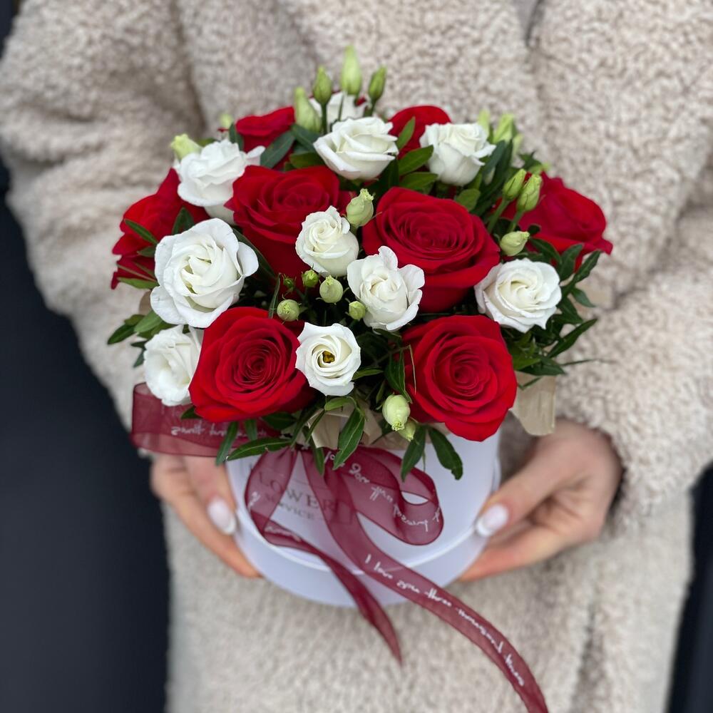 Классическая коробка с красными розами и эустомой!