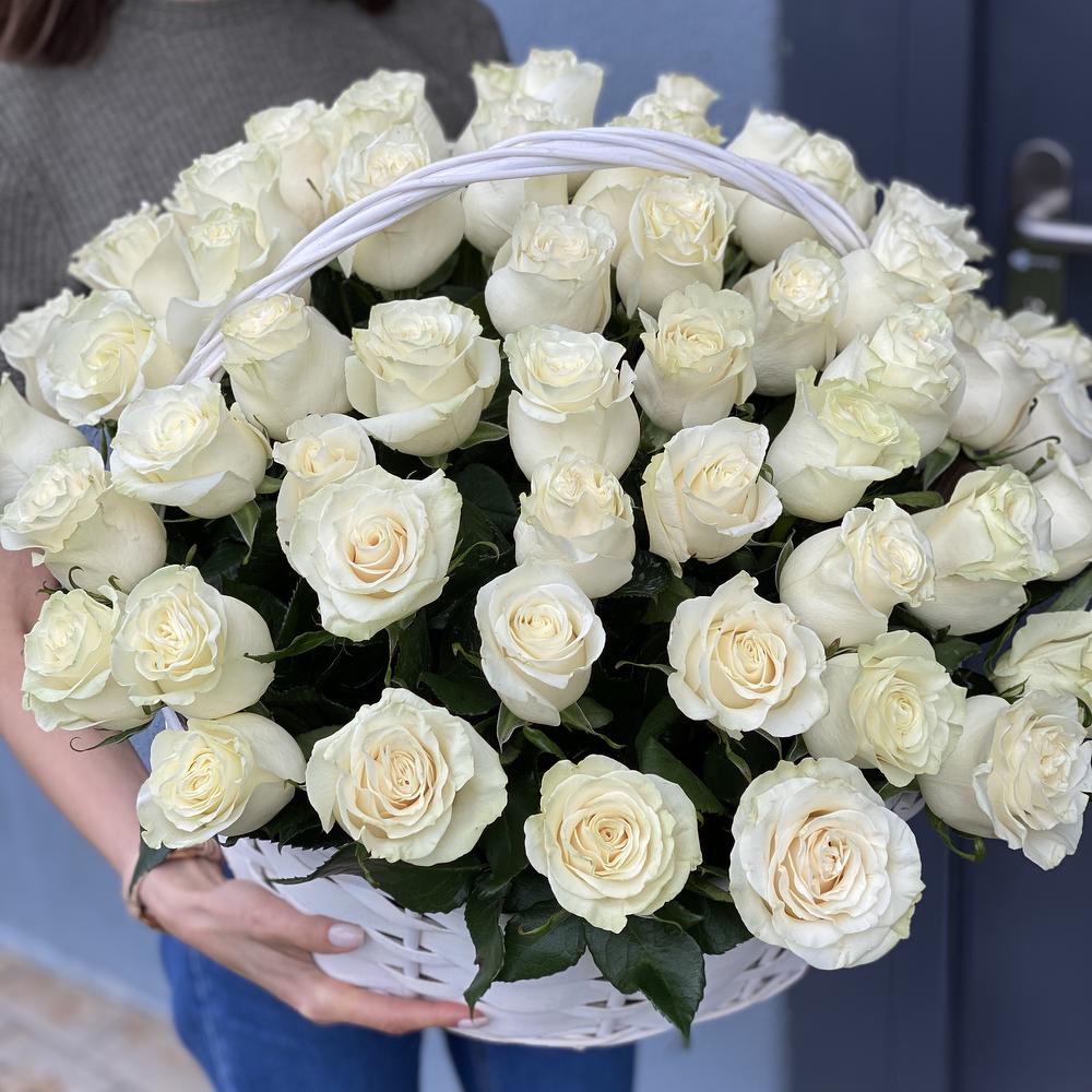 Метки: Белые розы, от 5000 руб, Роза Роза 40 см, Розы в корзине, цветы в корзине