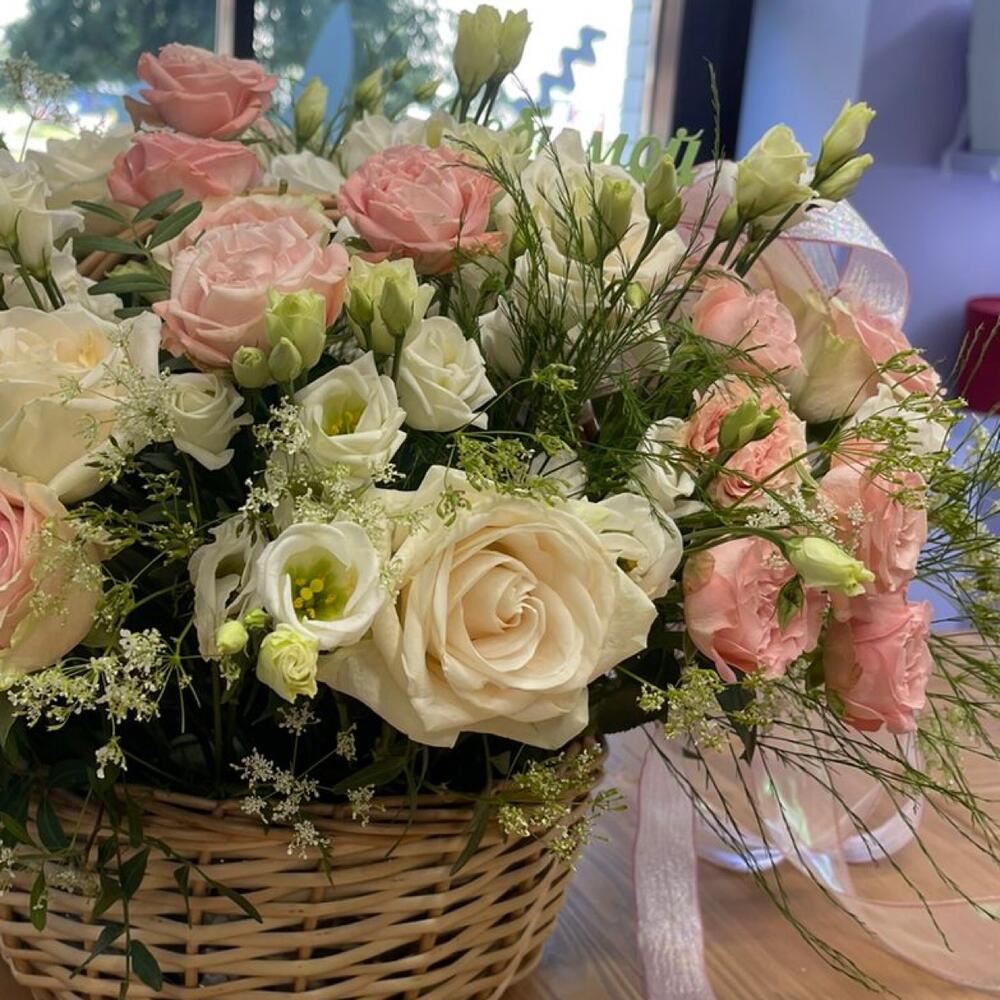 Роза Эквадор – 17 шт.Лента атласная – 2 шт.Фисташка – 7 шт.Корзина плетеная – 1 шт.Оазис флористический – 2 шт.эустома белая – 10 шт.Кустовая роза пионовидная – 10 шт.