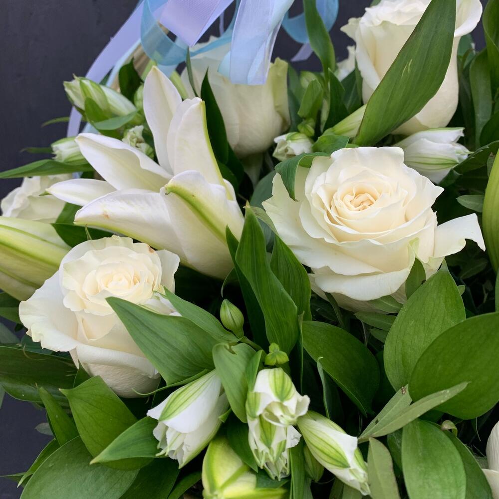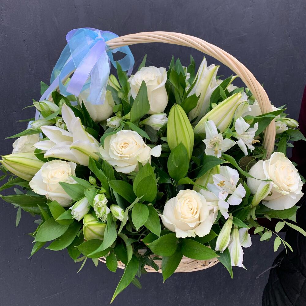 Корзина с белыми розами, лилиями и альстромериями «Весенний сад»