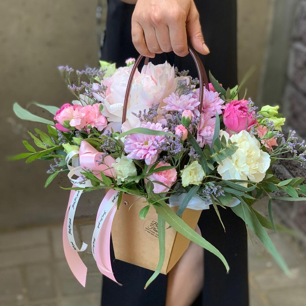 Крафт – 1 шт.Пион – 1 шт.Хризантема кустовая – 1 шт.Роза кустовая – 2 шт.Гвоздика – 3 шт.Гвоздика кустовая – 1 шт.Эустома – 1 шт.Лимониум – 1 шт.зелень декоративная – 1 шт.