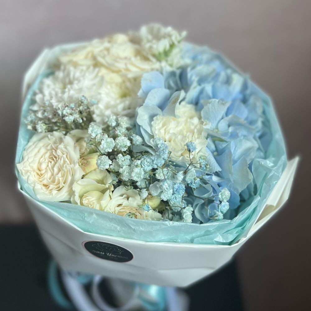 Гортензия – 1 шт.Гвоздика – 2 шт.Кустовая роза – 2 шт.Хризантема – 1 шт.Гипсофила – 1 шт.Маттиола – 1 шт.декоративная упаковка – 1 шт.Атласная лента – 1 шт.