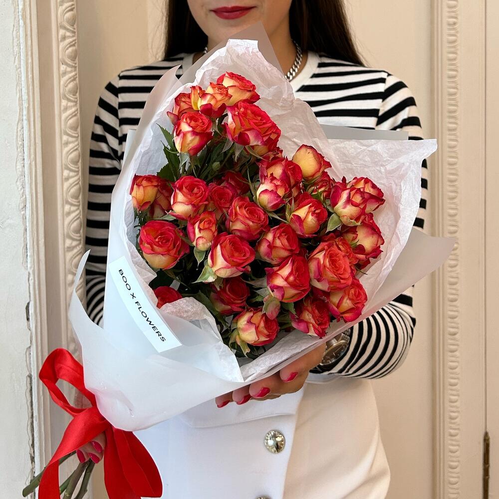 Кустовая роза – 5 шт.Дизайнерская упаковка – 1 шт.Лента атласная – 1 шт.