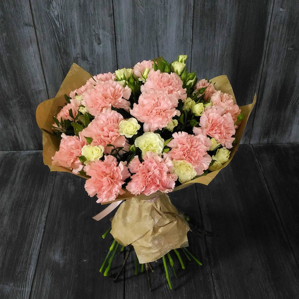 Гвоздика – 17 шт.Роза кустовая местная 50 см – 9 шт.Писташ – 10 шт.Дизайнерская упаковка – 1 шт.