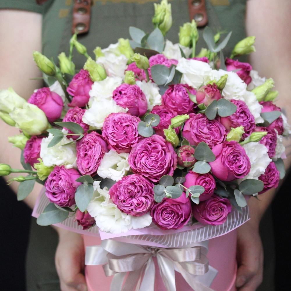 Роза пионовидная – 9 шт.Эустома – 6 шт.Эвкалипт – 5 шт.Пленка дизайнерская – 1 шт.Оазис флористический – 1 шт.Шляпная коробка – 1 шт.