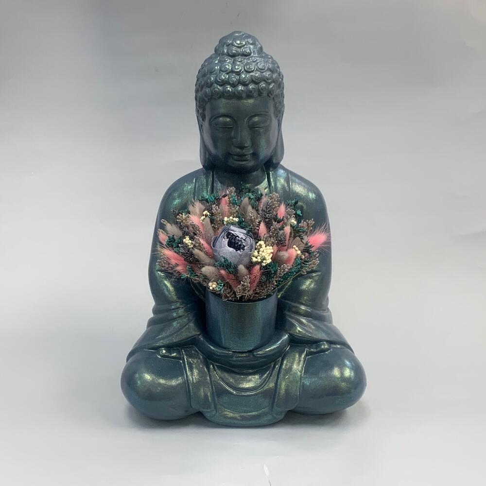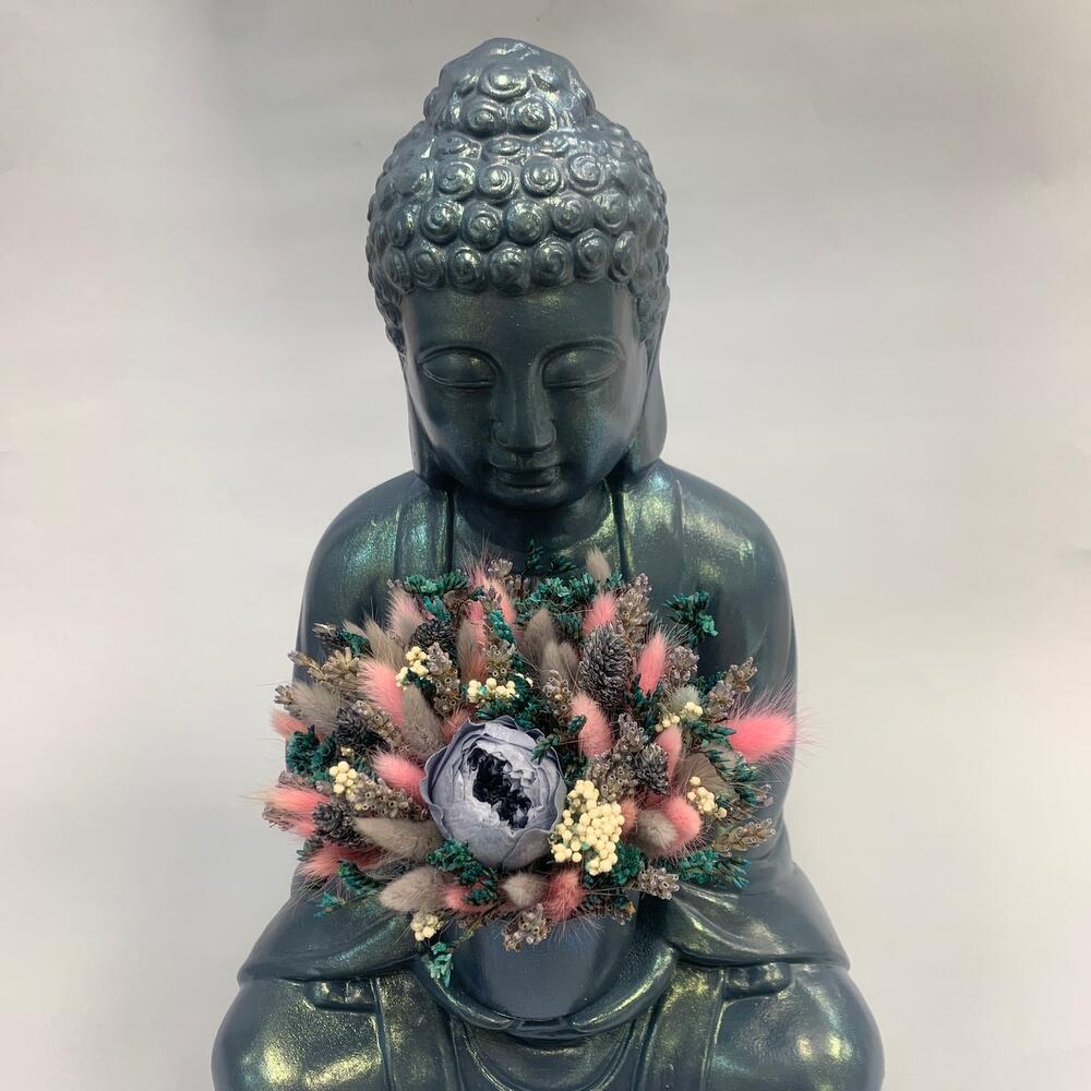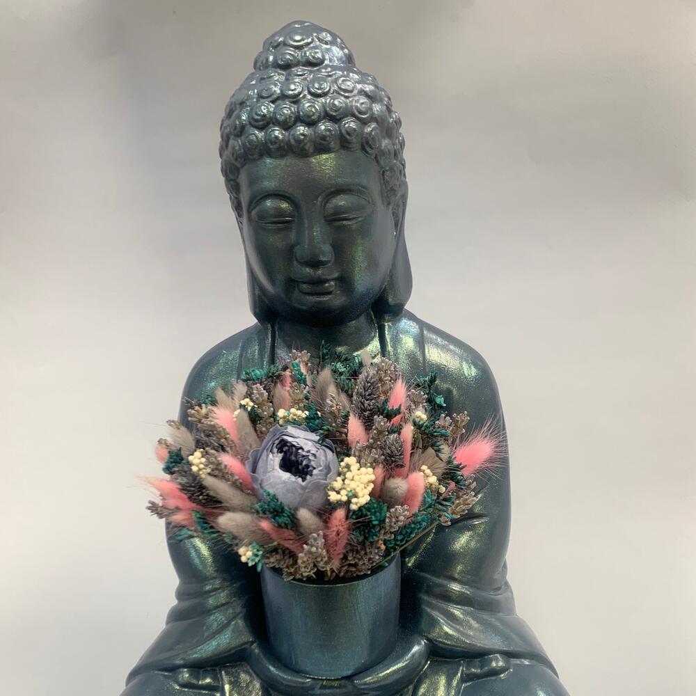 кашпо гипсовое будда – 1 шт.лагурус микс – 50 шт.Роза стабилизированная – 1 шт.Лаванда (сухоцвет) – 40 гр.Озотамнус – 1 шт.Лимониум – 1 шт.
