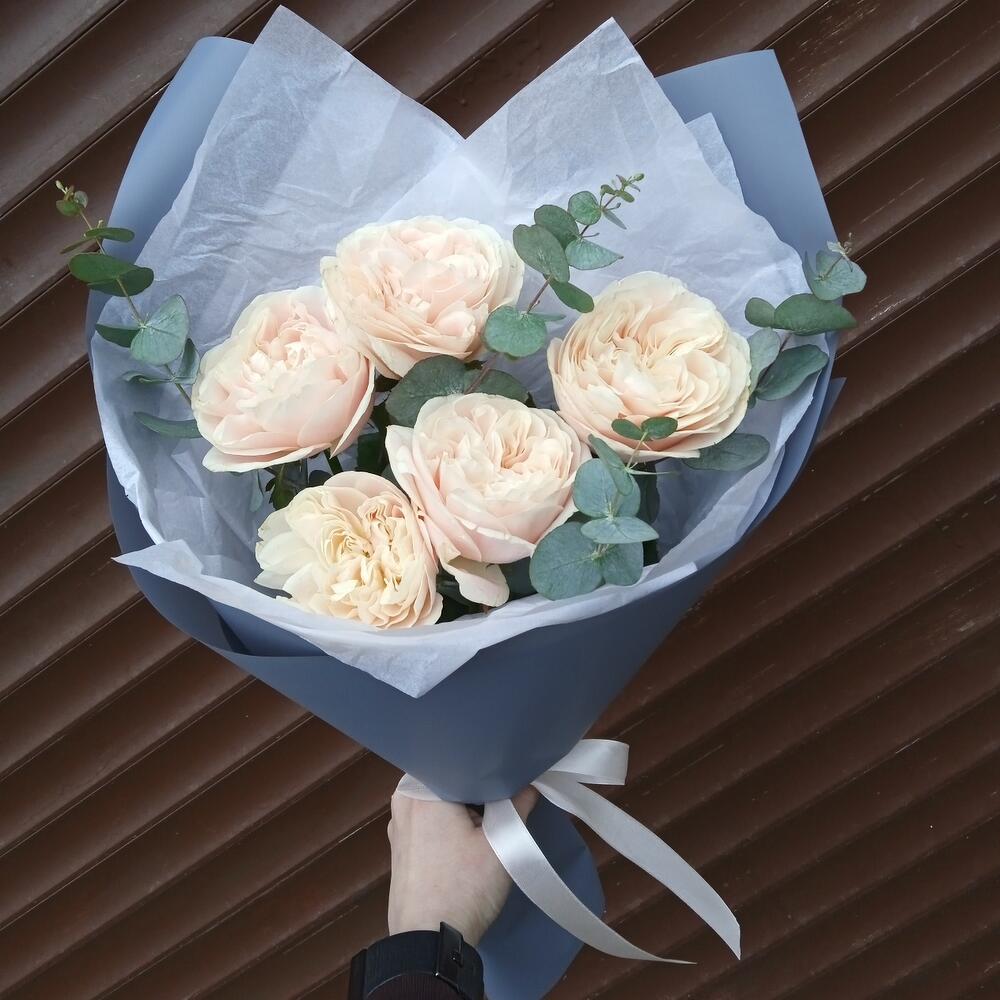 Моно букет из 5 пионовидных роз с эвкалиптом
