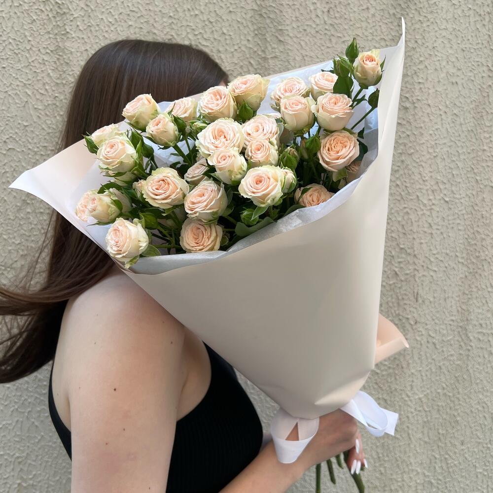 Лента атласная – 2 шт.Упаковка дизайнерская – 2 шт.Упаковка тишью – 1 шт.подкормка для срезанных цветов – 1 шт.кустовые пионовидные розы – 5 шт.