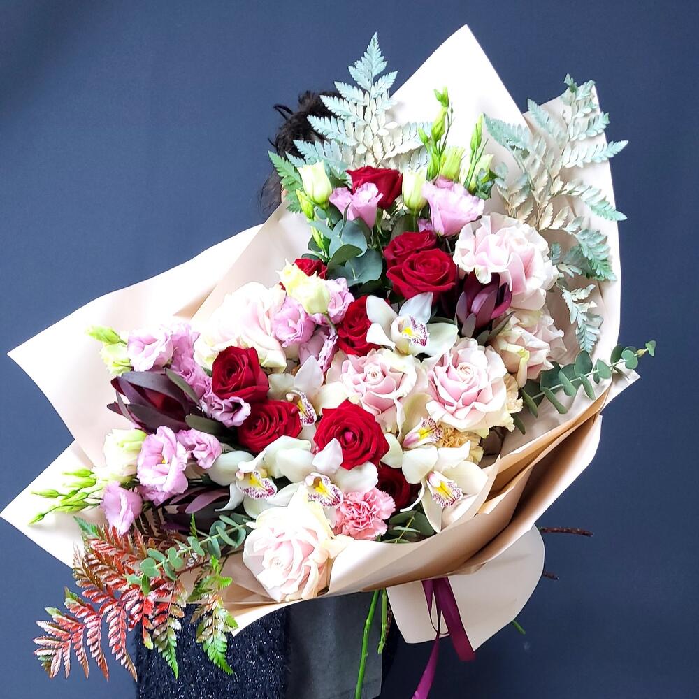 левкадендрон – 3 шт.Лизиантус – 5 шт.Орхидея Цимбидиум – 6 шт.Папоротник – 3 шт.Эвкалипт – 5 шт.Роза – 9 шт.Роза Эквадор – 6 шт.Гвоздика – 5 шт.Фисташка – 7 шт.Упаковка дизайнерская – 1 шт.