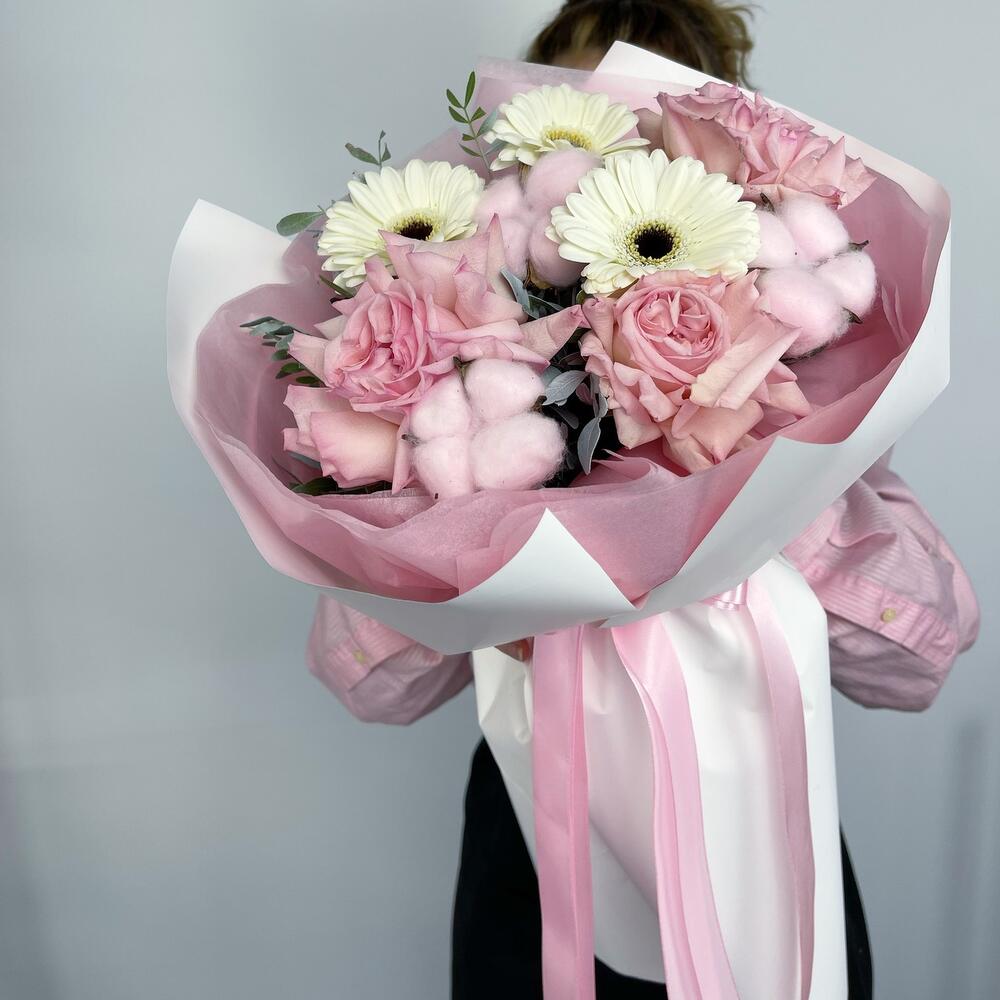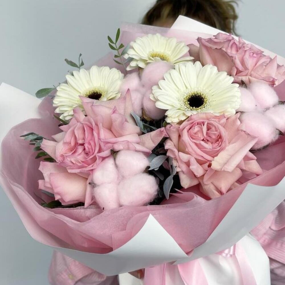 Хлопок – 3 шт.Роза – 3 шт.Лента атласная – 1 шт.Гербера – 3 шт.Фисташка – 1 шт.Пленка матовая – 2 шт.