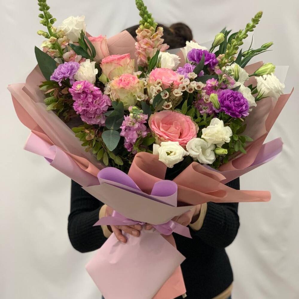 антиринум – 3 шт.Диантус – 4 шт.Роза Эквадор – 5 шт.Лизиантус – 3 шт.Фисташка – 6 шт.Эвкалипт – 6 шт.Ваксфлауэр – 2 шт.Маттиола – 3 шт.Упаковка дизайнерская – 2 шт.