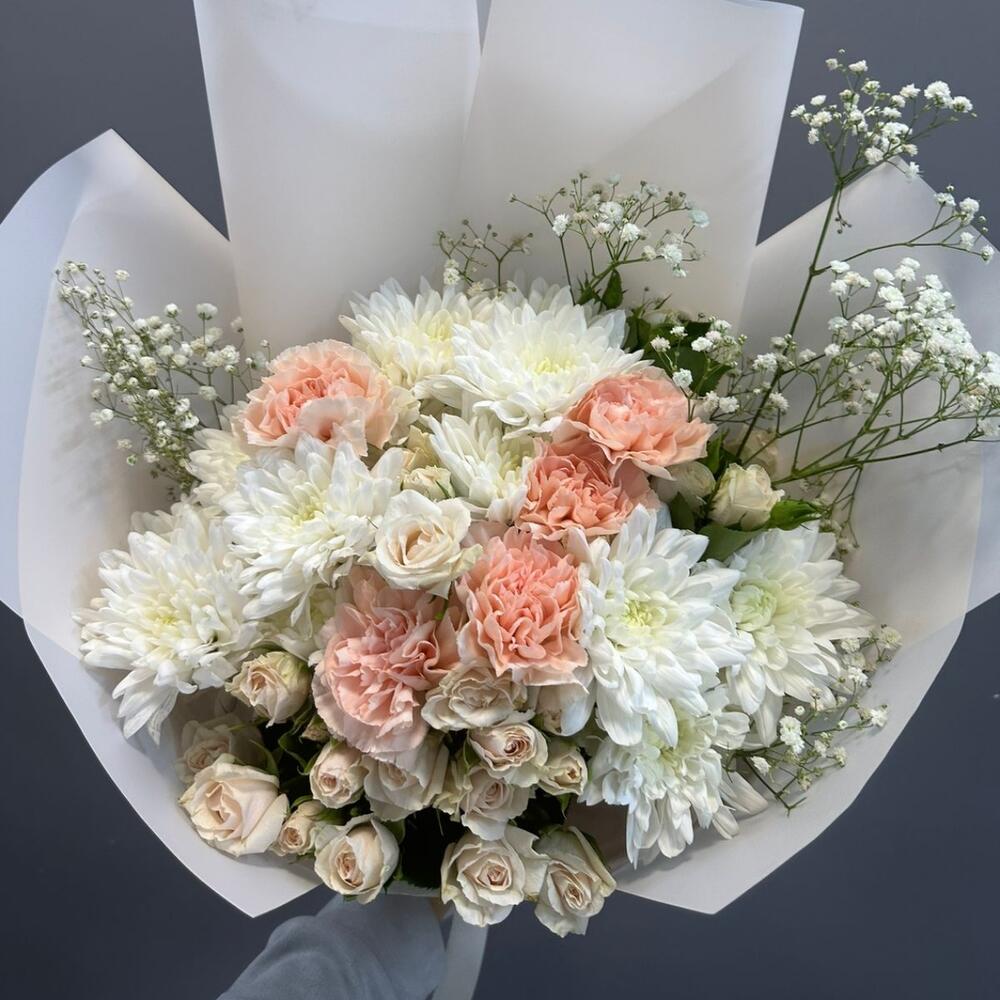 Хризантема кустовая – 3 шт. Гвоздика – 5 шт. Кустовая роза – 5 шт. Гипсофила – 2 шт.